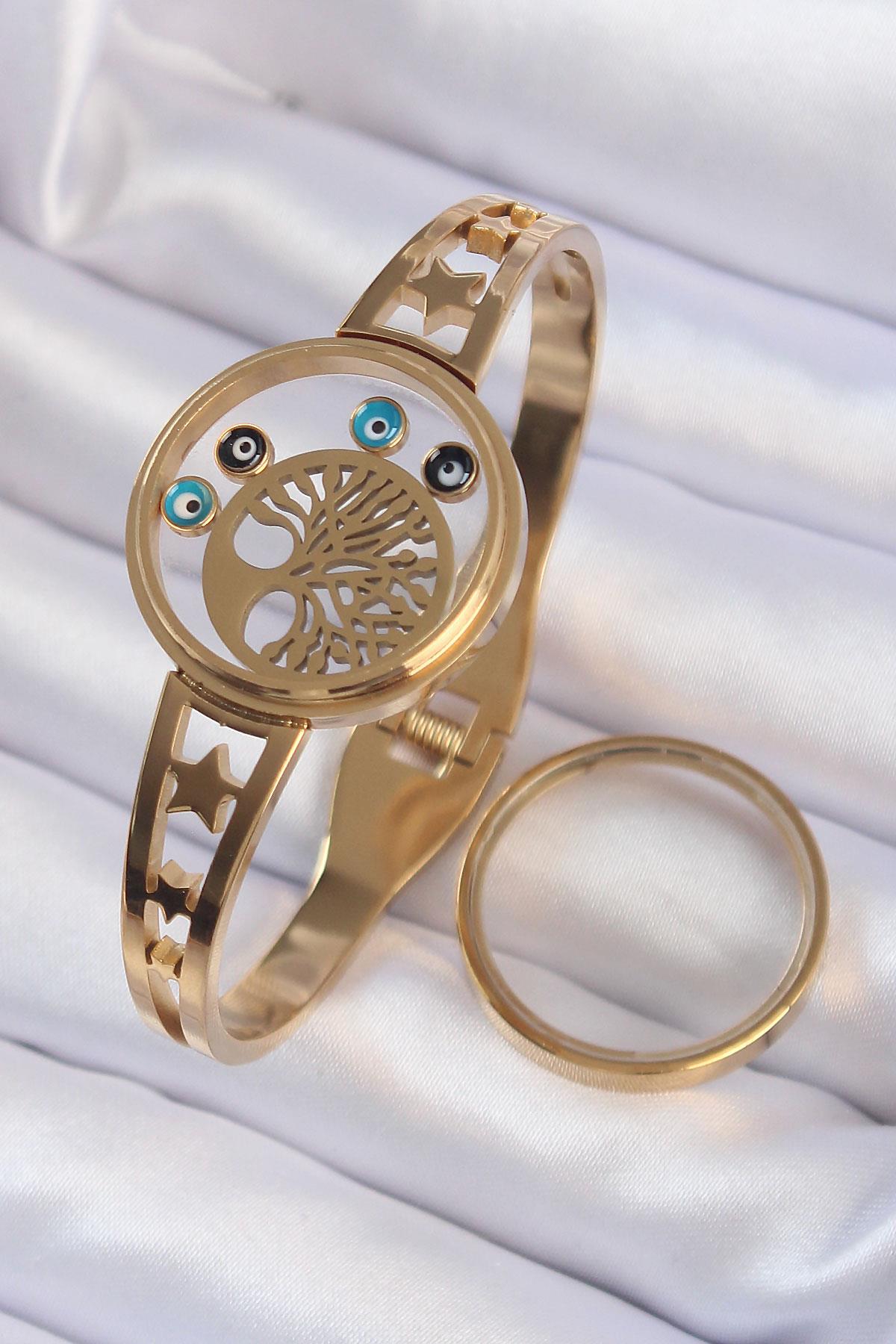 316L Çelik Altın Renk İçi Yaşam Ağacı ve Nazar Boncuk Figürlü Açılabilir Fanus Kelepçe