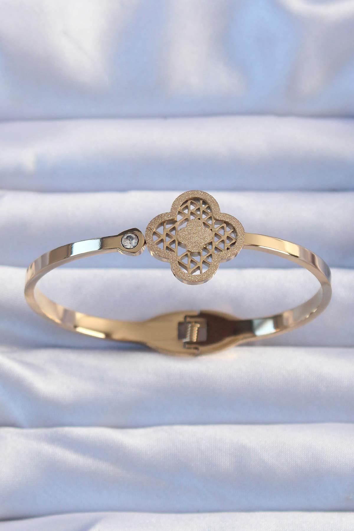 316L Çelik Altın Renk Zirkon Taşlı Simli Yonca Kelepçe