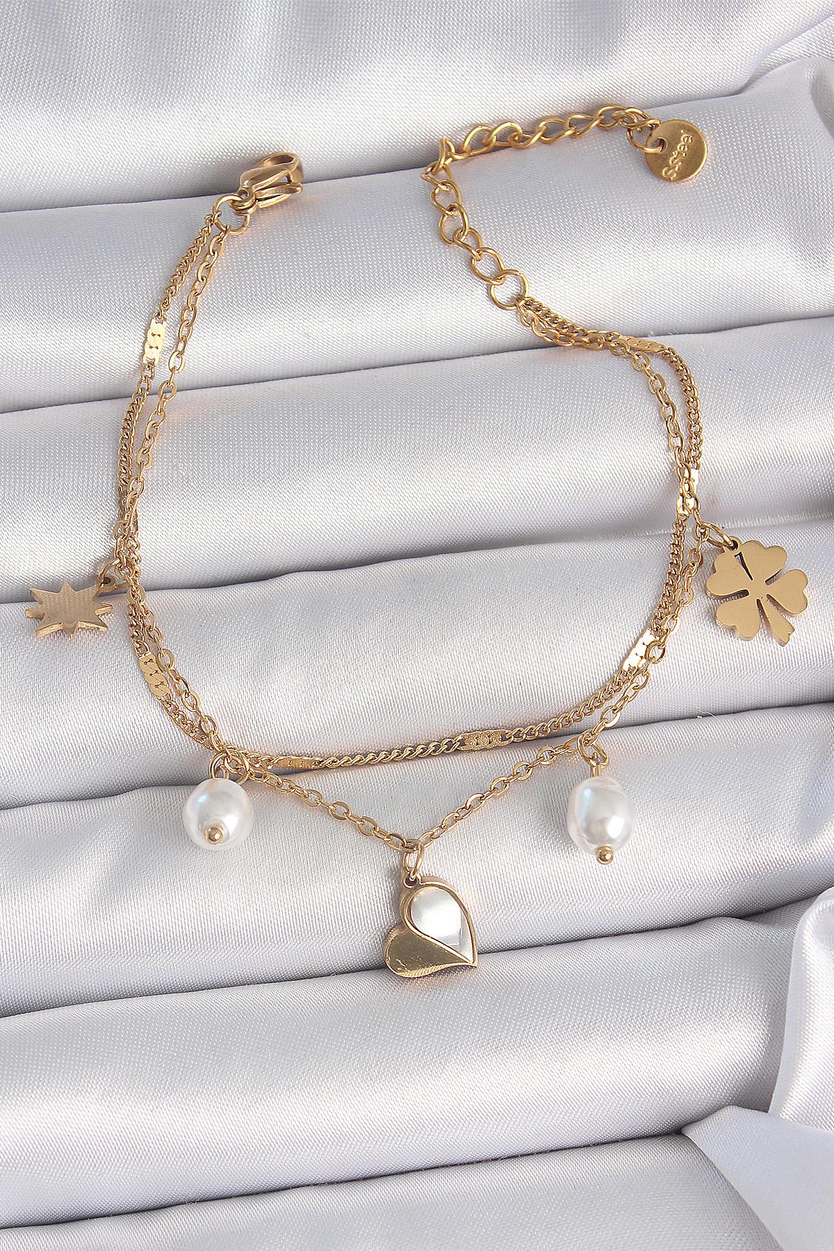 316L Çelik Gold Renk 2'li Zincir Model Sallantı Kalp Figür Yonca Detay Kadın Bileklik