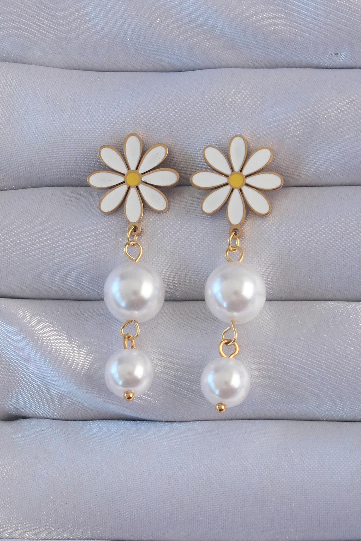 316L Çelik Gold Renk İnci Taşlı Papatya Model Sallantılı Küpe