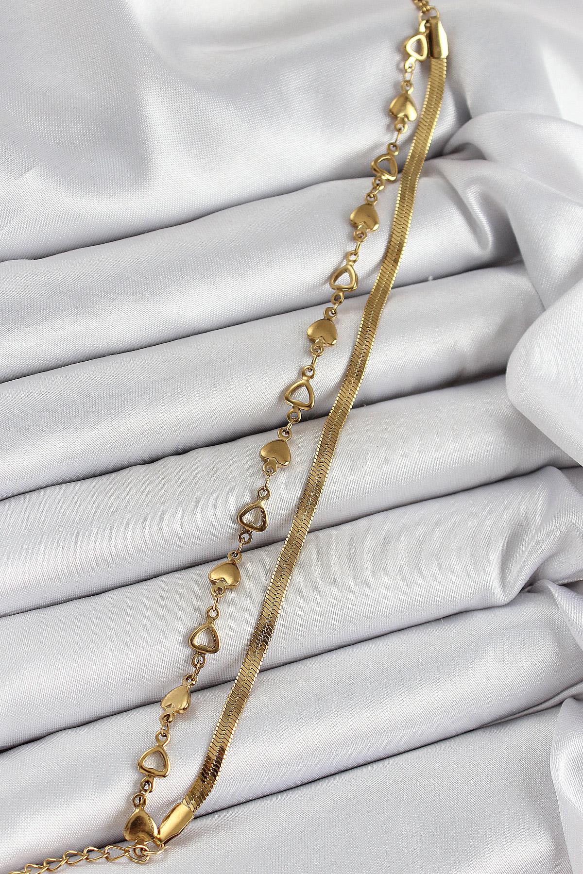 316L Çelik Gold Renk Kalpli Zincir ve İtalyan Zincirli 2'li Kadın Bileklik