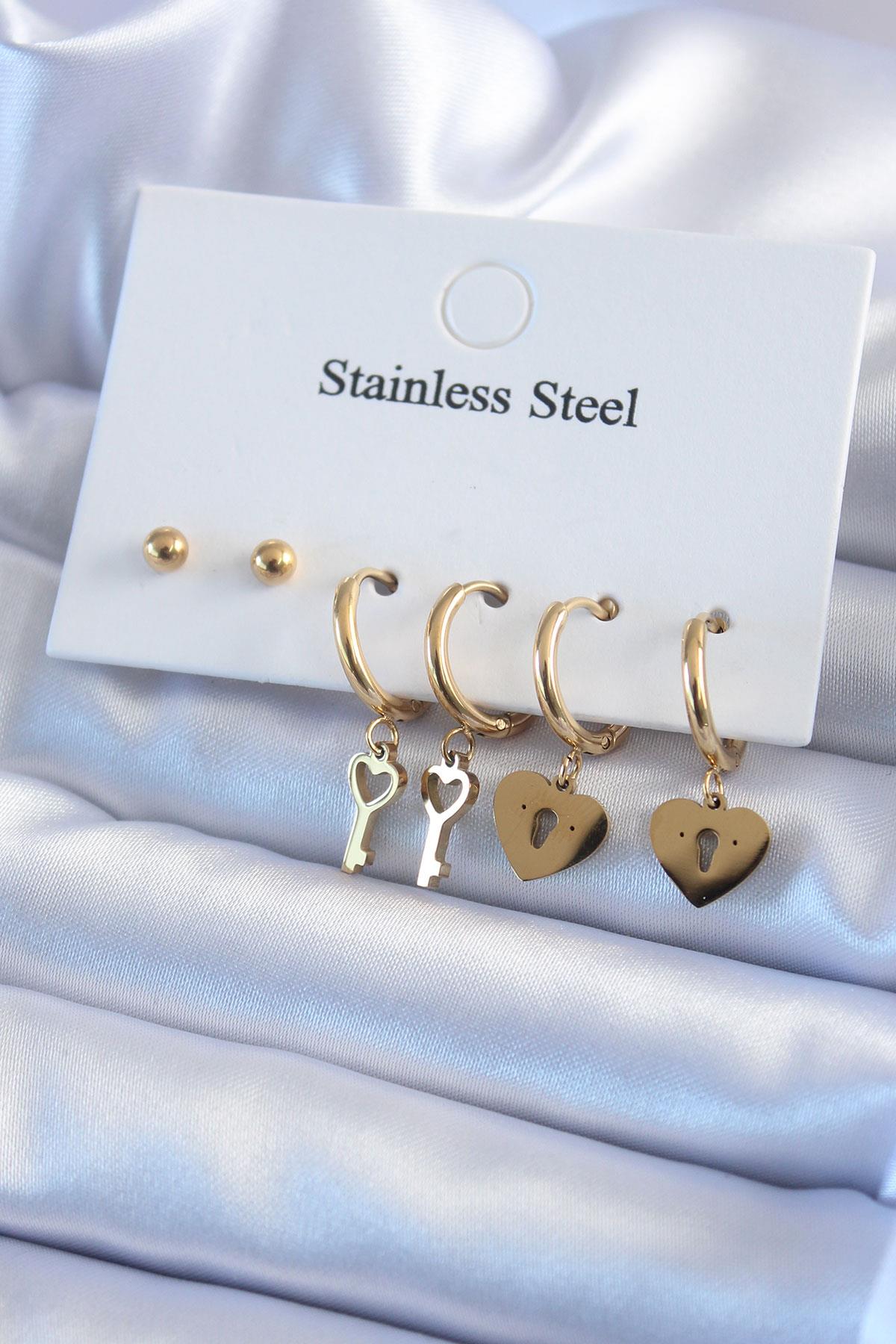 316L Çelik Gold Renk Kilit Kalp Model Kalp Anahtar Detay Kadın Küpe Seti