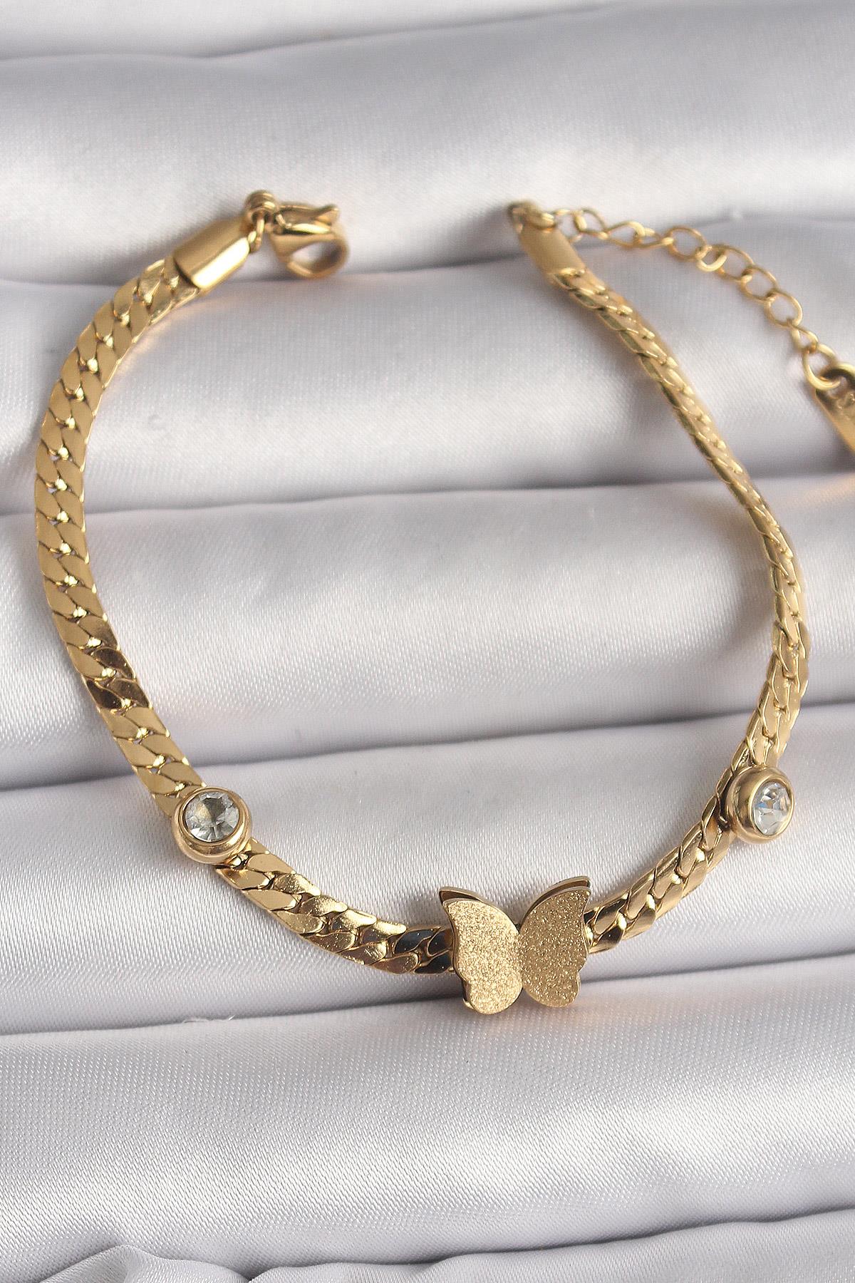 316L Çelik Gold Renk Yassı Zincir Zirkon Taşlı Simli Kelebek Figür Kadın Bileklik