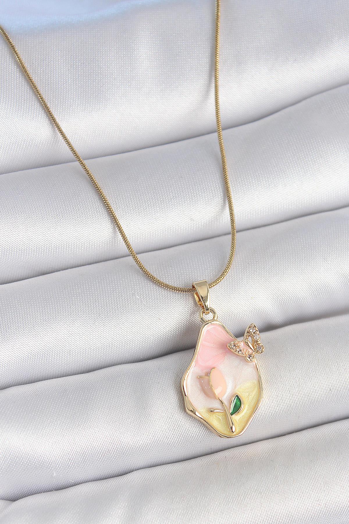 316L Çelik Gold Renk Zincir Damla Mix Renk Çiçek İşlemeli Kelebek Detay Portre Model Kadın Kolye
