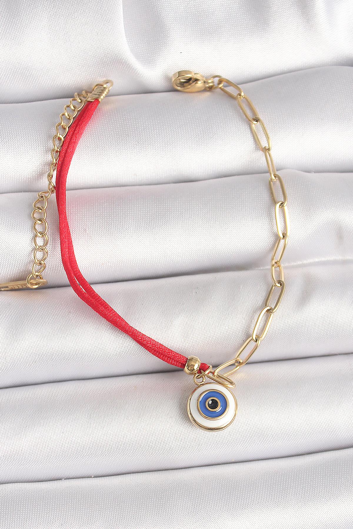 316L Çelik Gold Renk Zincir Kırmızı İp Model Sallantı Nazar Boncuk Figür Kadın Bileklik