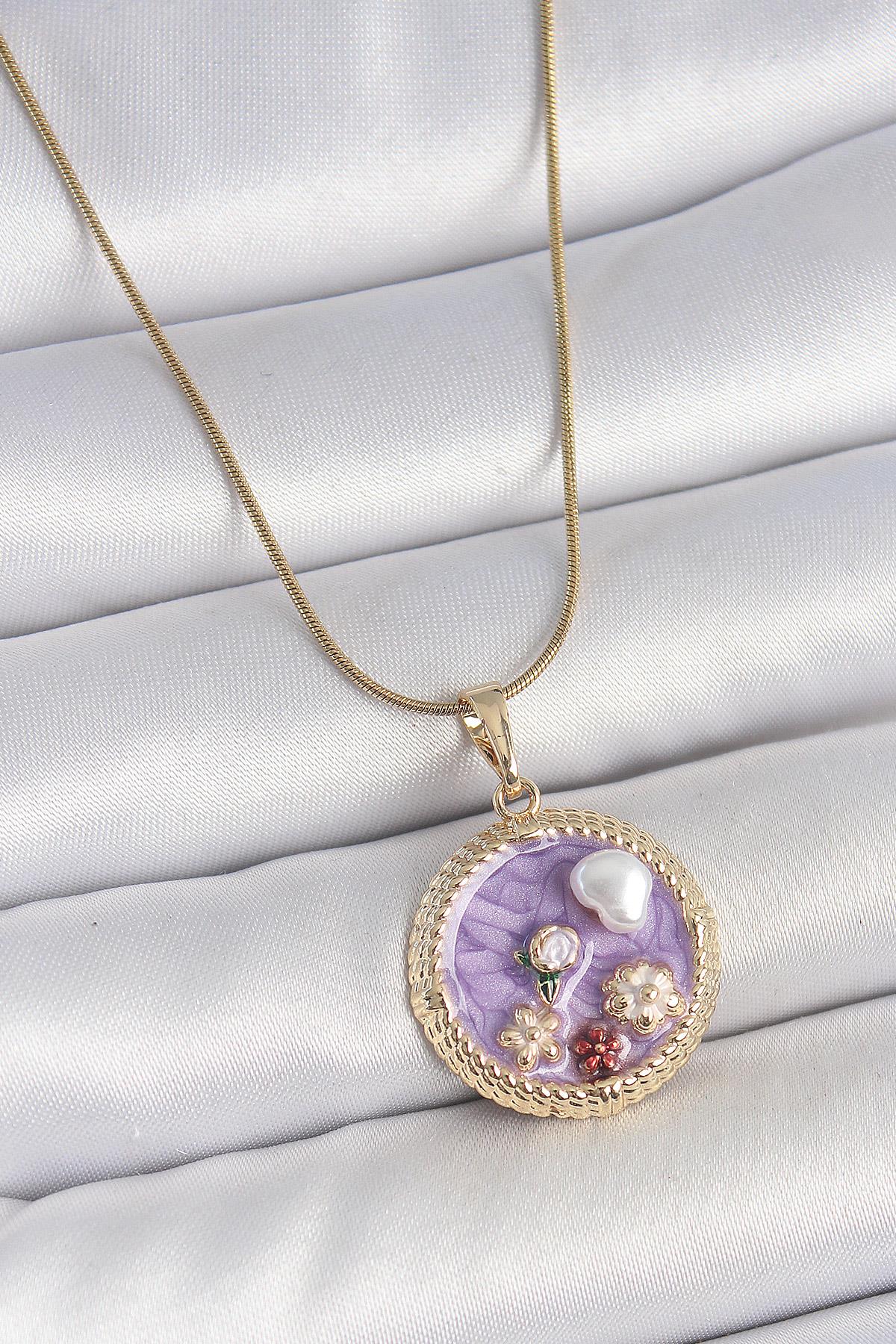 316L Çelik Gold Renk Zincir Mor Mineli İncili Çiçek İşlemeli Madalyon Model Kadın Kolye