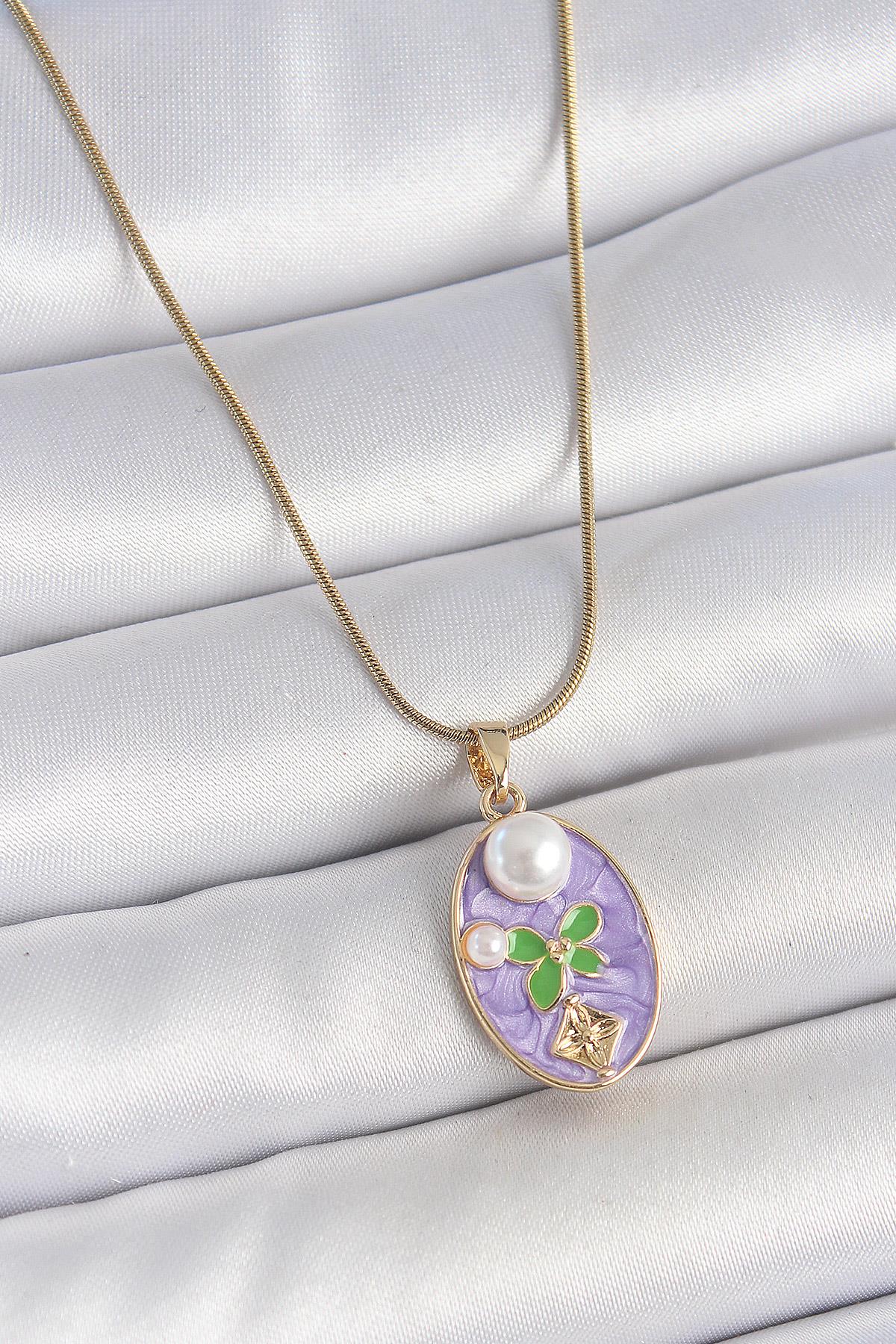 316L Çelik Gold Renk Zincir Mor Mineli Oval İncili Çiçek İşlemeli Portre Model Kadın Kolye
