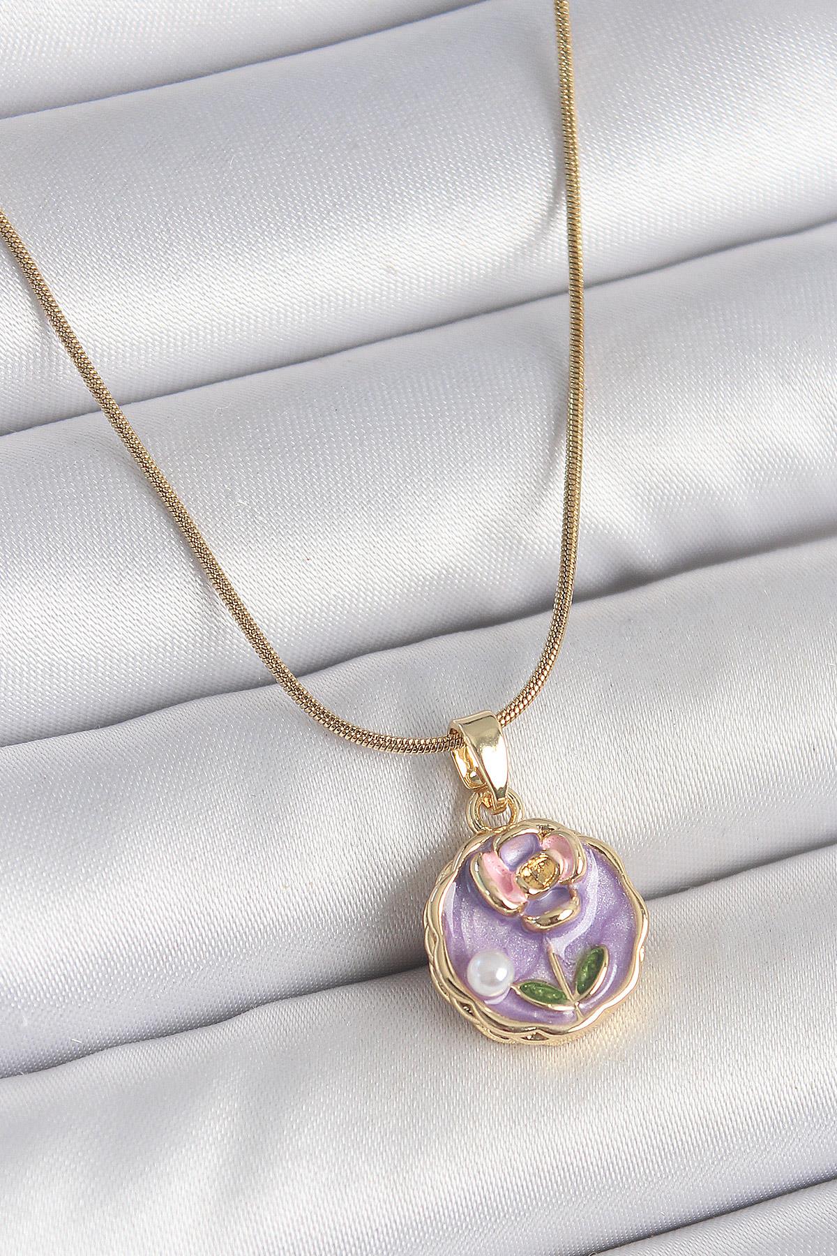 316L Çelik Gold Renk Zincir Mor Minimal Çiçek İşlemeli İnci Detay Portre Model Kadın Kolye