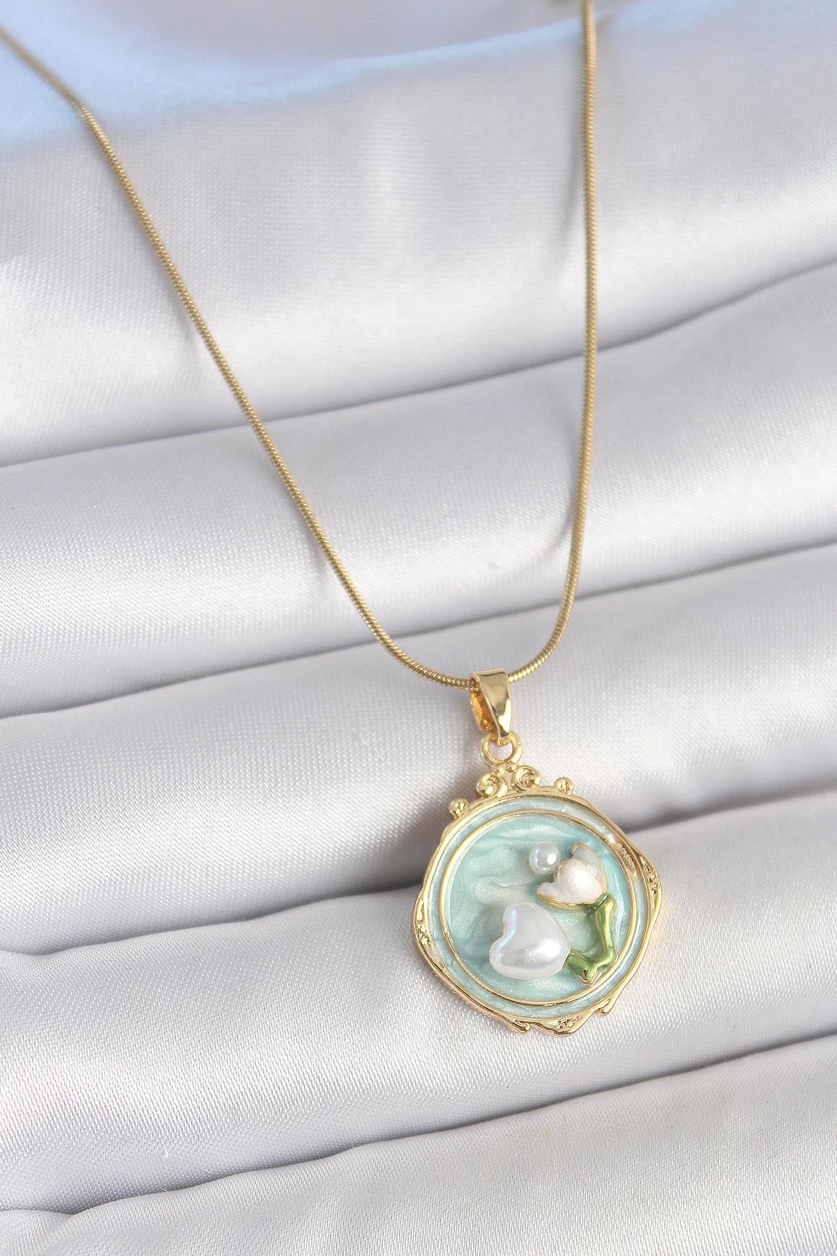 316L Çelik Gold Renk Zincir Turkuaz Mineli İncili Çiçek İşlemeli Portre Model Kadın Kolye