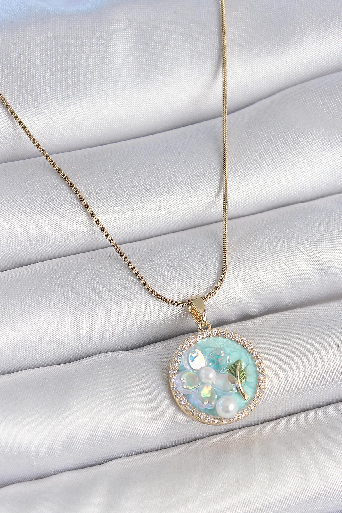 316L Çelik Gold Renk Zincir Zirkon Taş Detaylı Mavi Mineli Çiçek İşlemeli İnci Detay Kadın Kolye