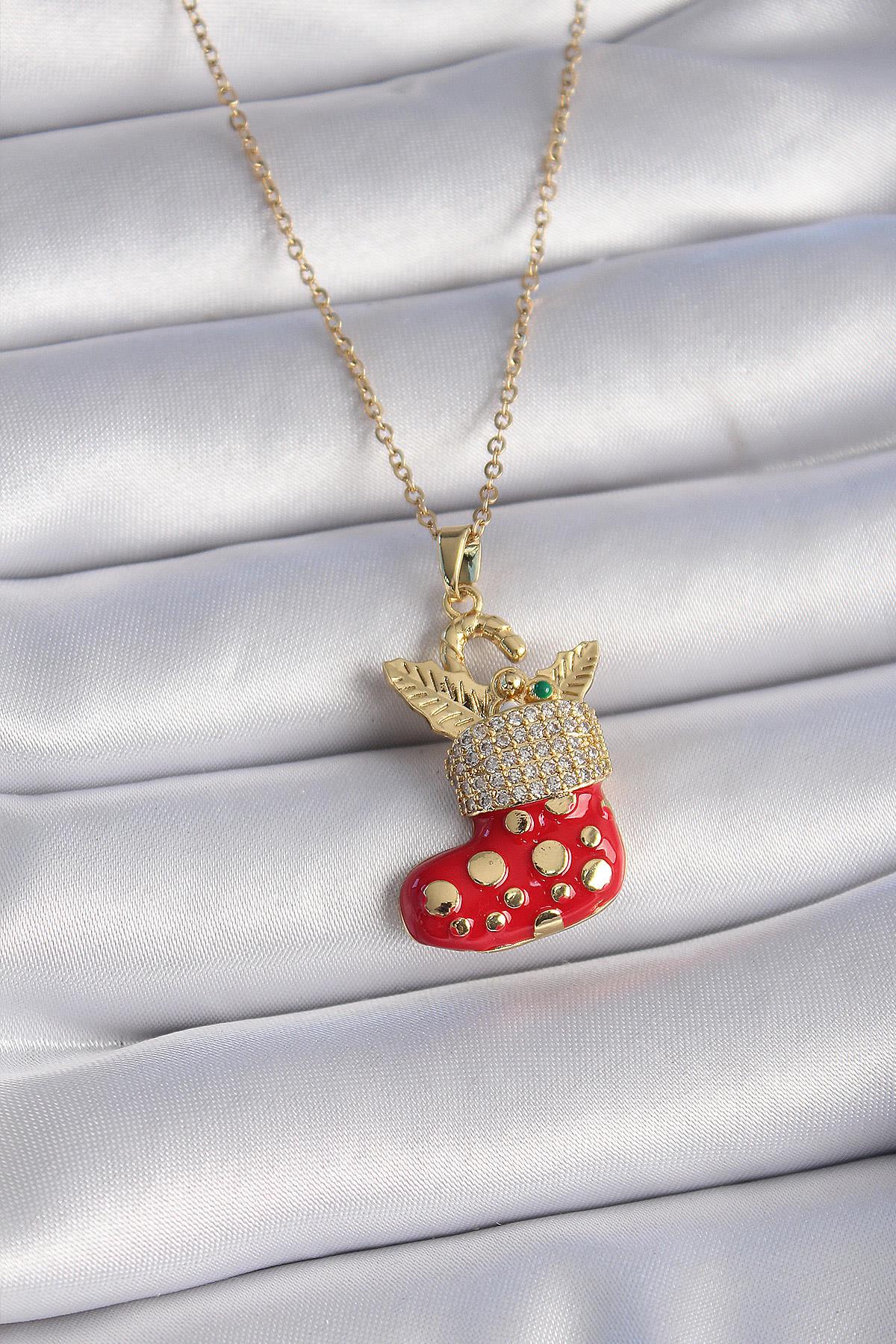 316L Çelik Gold Renk Zincir Zirkon Taşlı Yılbaşı Temalı Kırmızı Noel Çorabı Figür Kadın Kolye