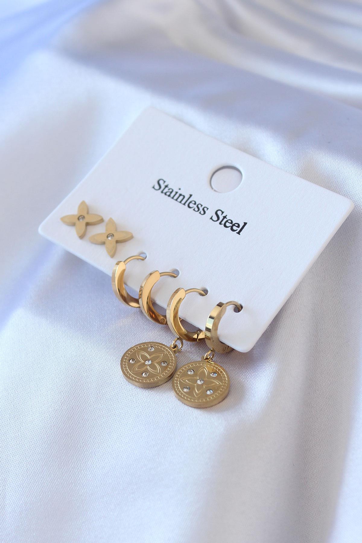 316L Çelik Gold Renk Zirkon Taş Detay Çiçek İşleme Kadın Küpe Seti