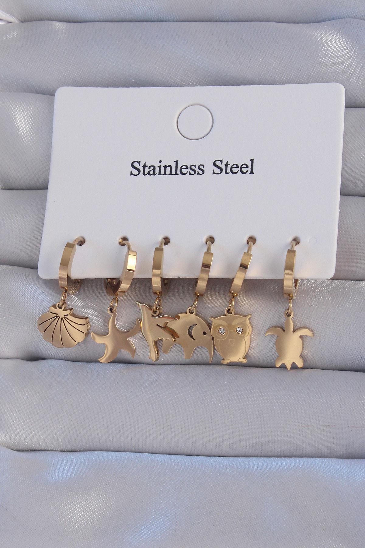 316L Çelik Gold Renk Zirkon Taşlı Hayvan Figürlü Deniz Yıldızı Model Halka Küpe Seti