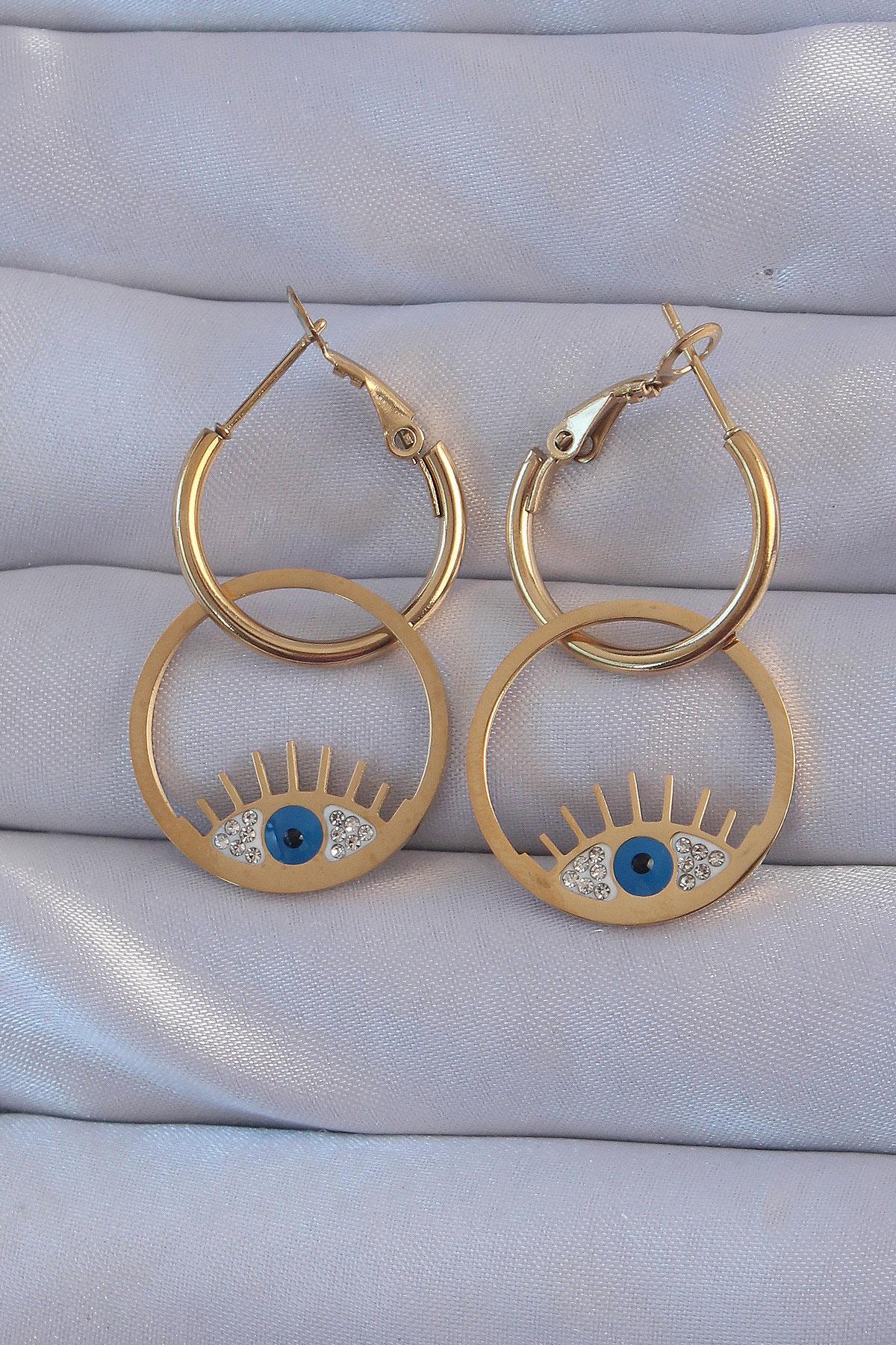 316L Çelik Gold Renk Zirkon Taşlı Mavi Göz Tasarımlı Halka Küpe