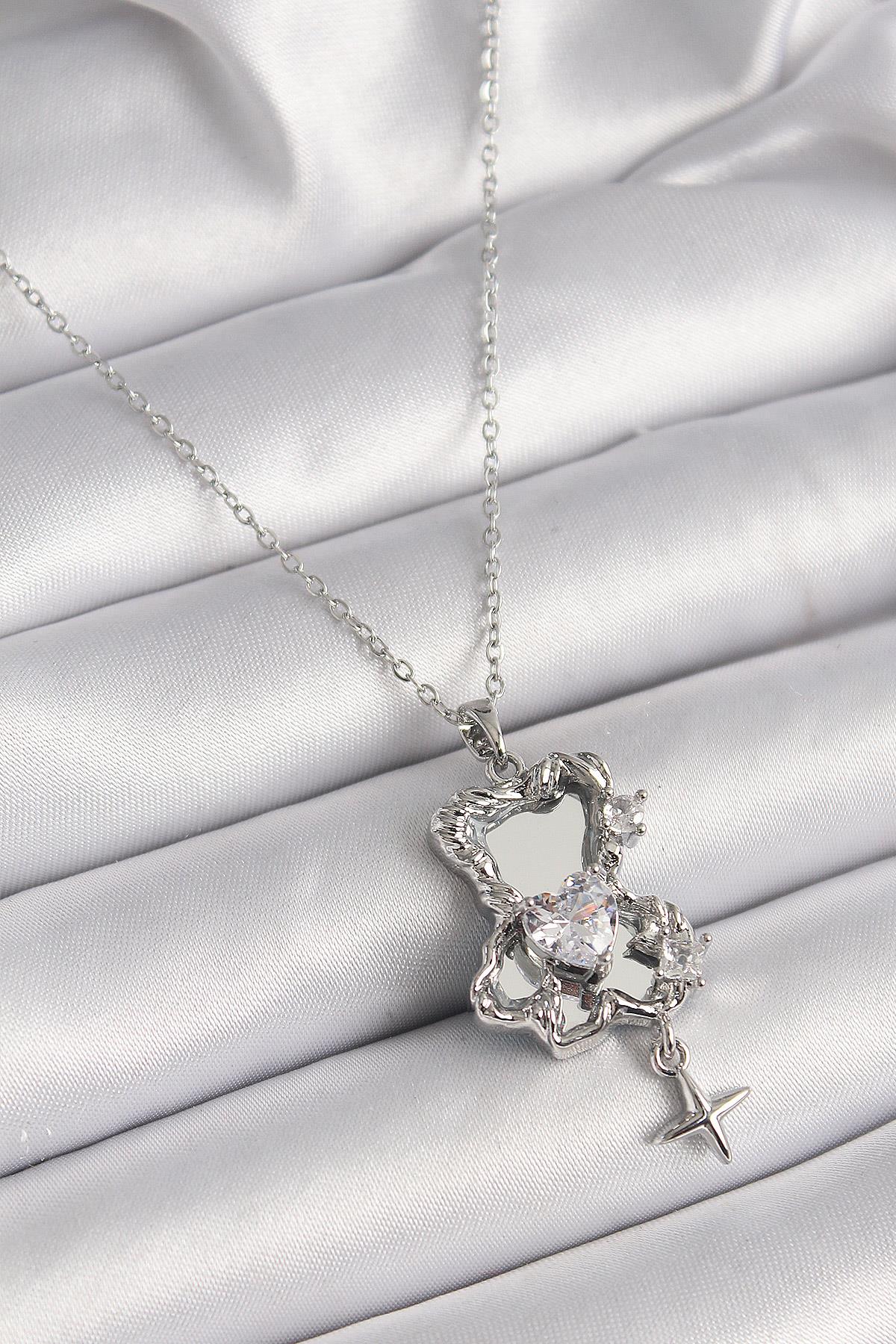 316L Çelik Gümüş Renk Ayna Ayıcık Model Zirkon Taşlı Kalp Detay Kadın Kolye