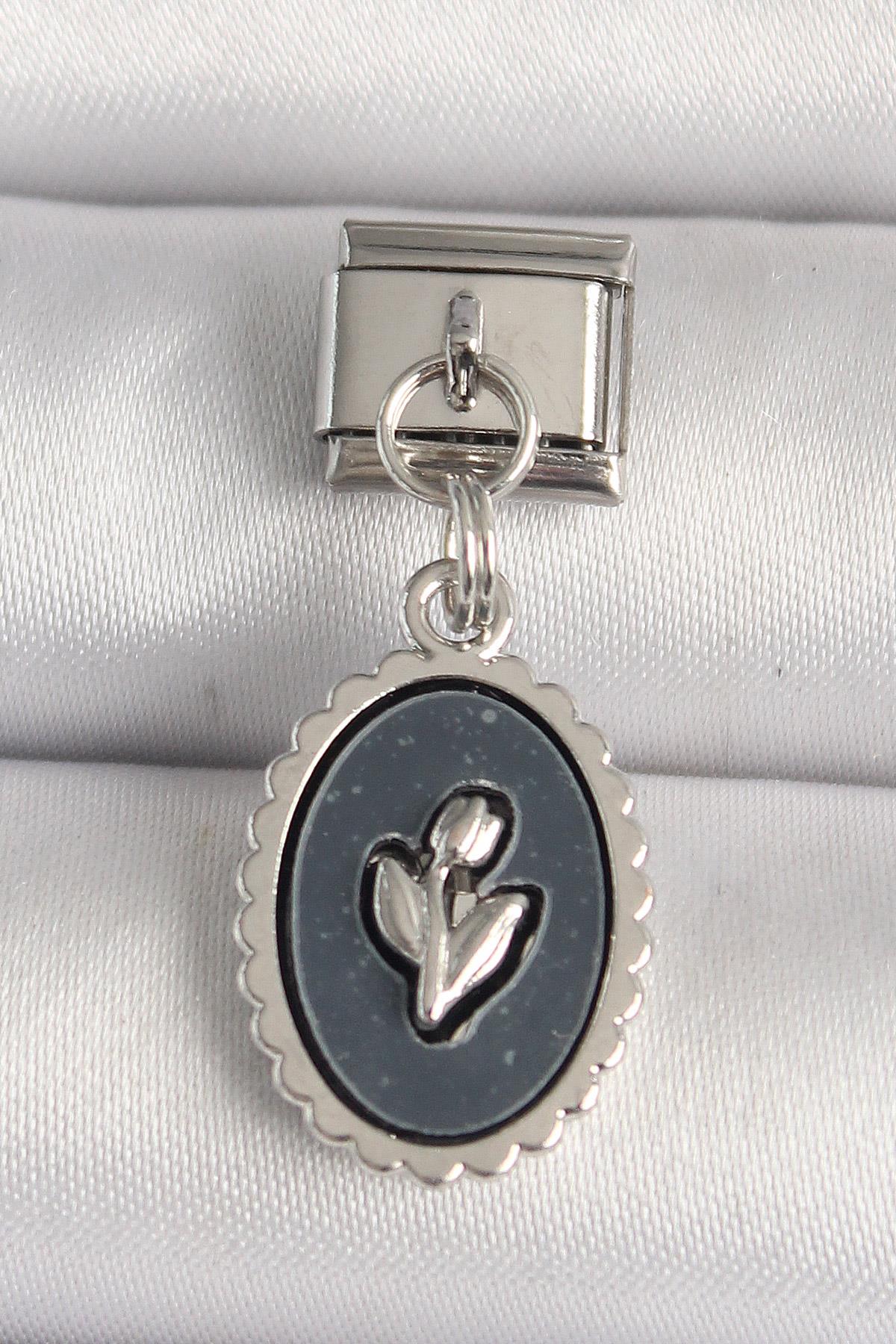 316L Çelik Gümüş Renk Çiçek İşlemeli Siyah Portre Model Nomination Charm