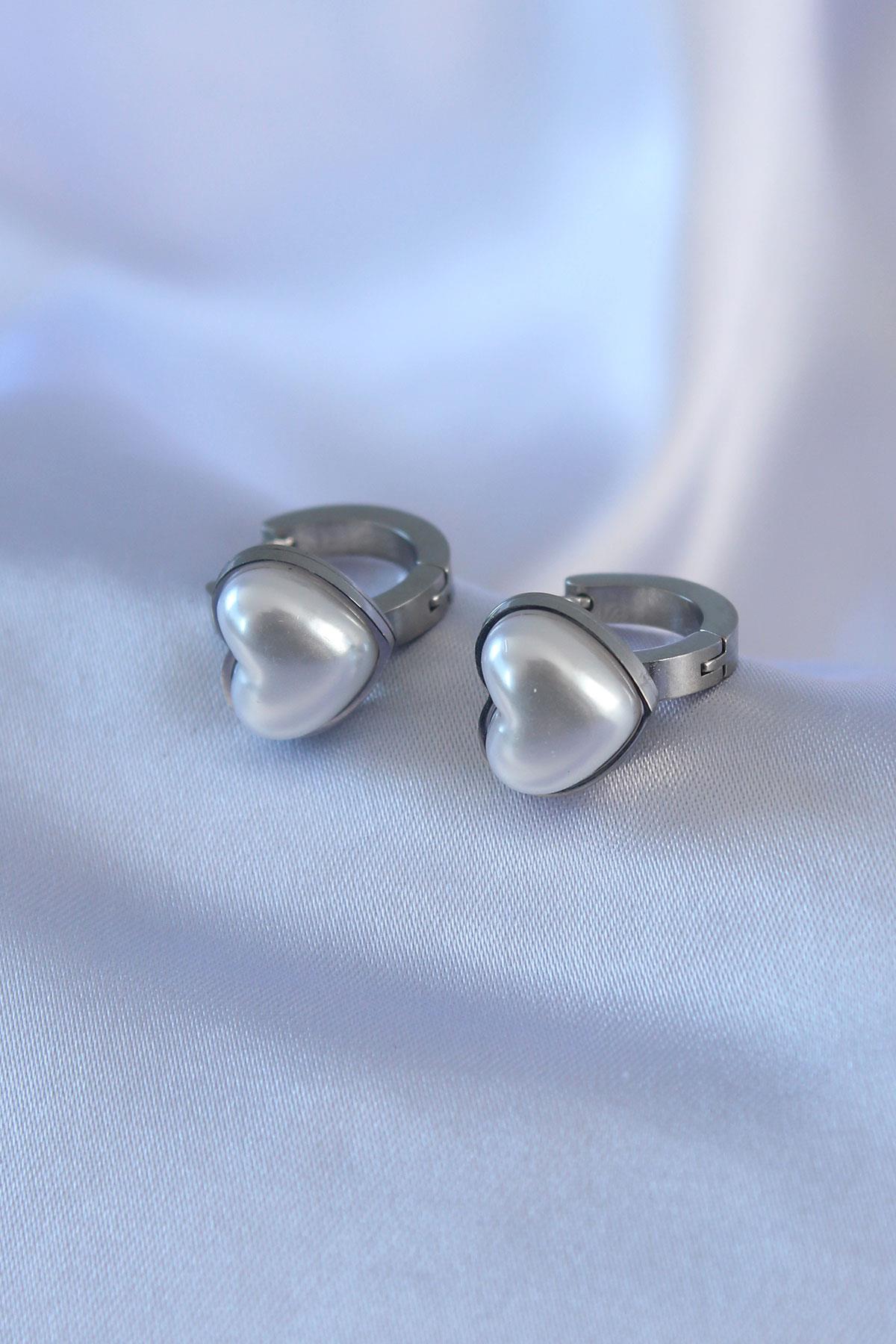316L Çelik Gümüş Renk İncili Kalp Model Kadın Küpe
