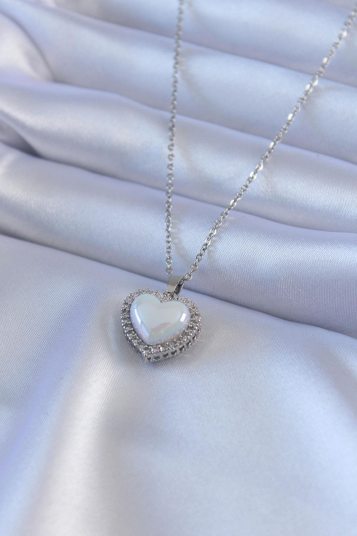 316L Çelik Gümüş Renk İncili Kalp Model Zirkon Taşlı Kadın Kolye