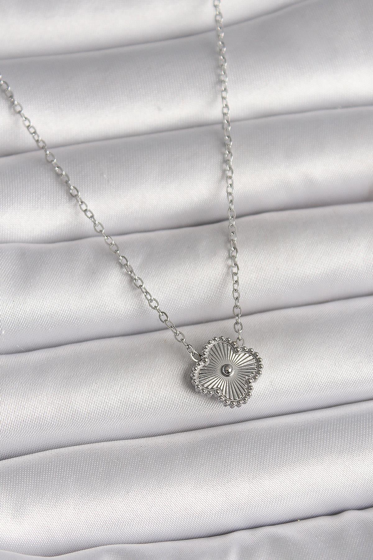316L Çelik Gümüş Renk İşleme Detaylı Yonca Model Kadın Kolye