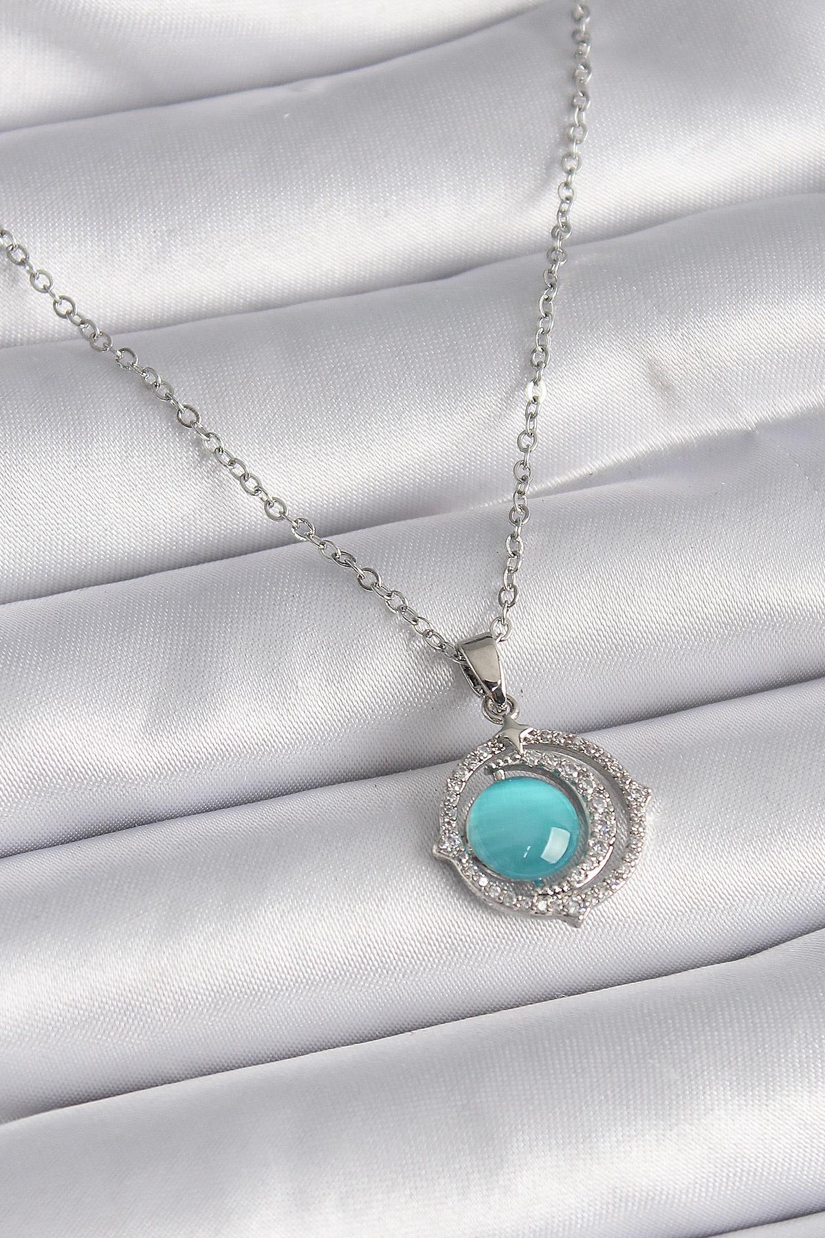 316L Çelik Gümüş Renk Mavi Sedefli Hilal Model Kadın Kolye