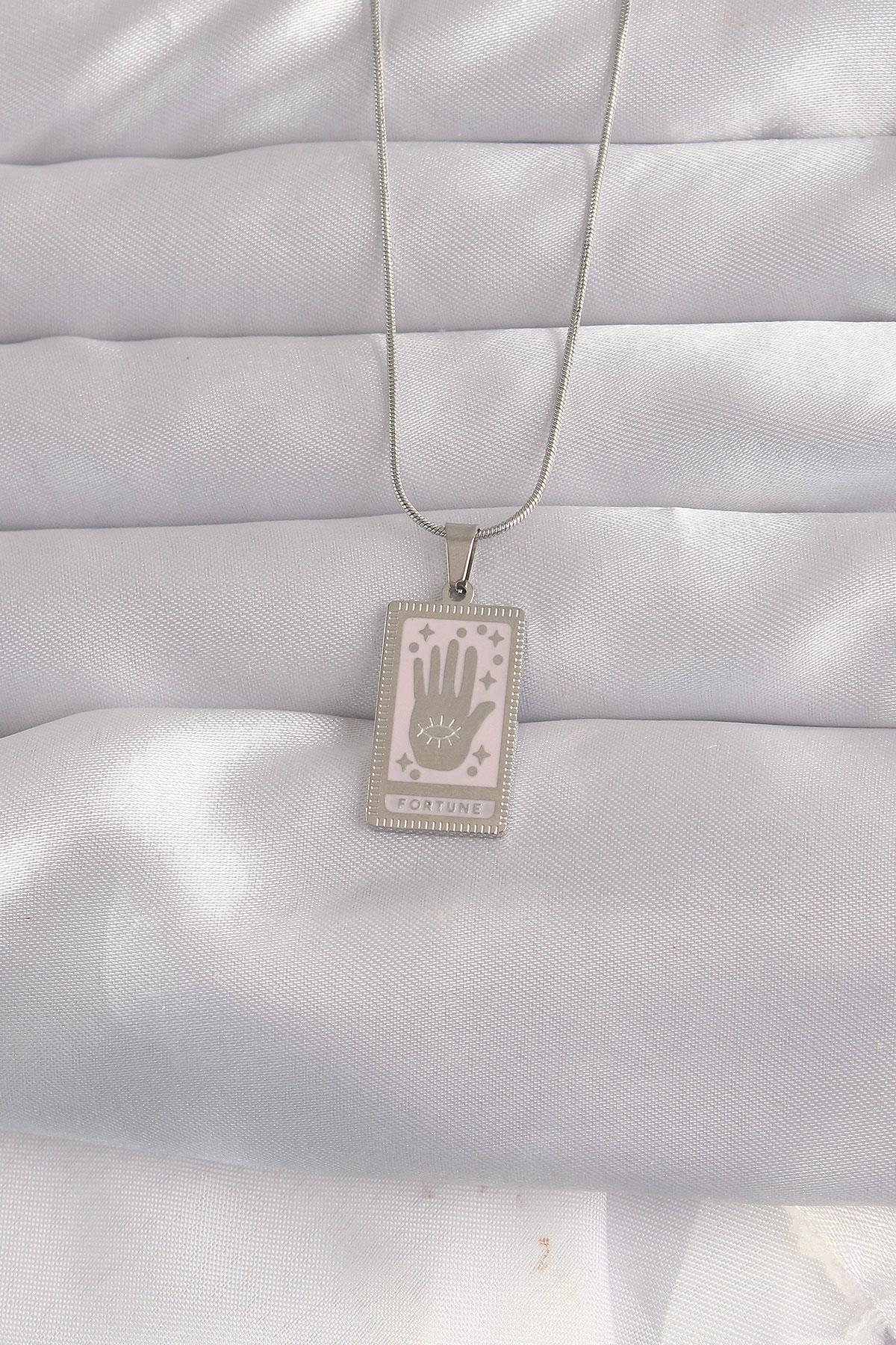 316L Çelik Gümüş Renk Pembe Mineli El Figür Tarot Kolye
