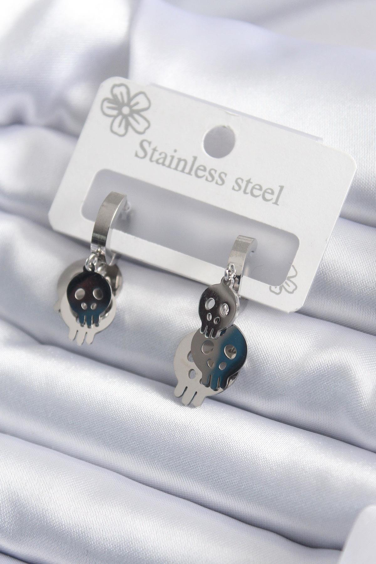 316L Çelik Gümüş Renk Sallantı Kuru Kafa Model Kadın Küpe