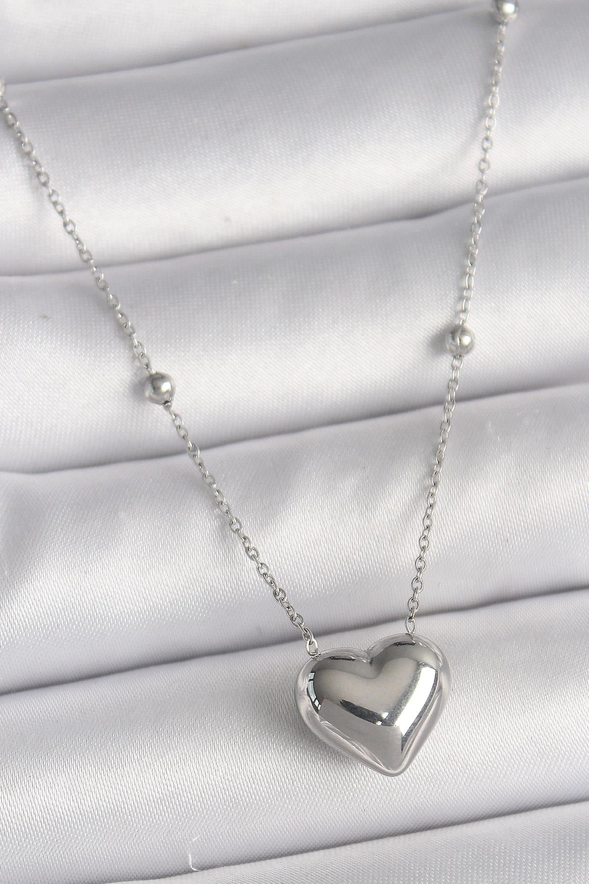 316L Çelik Gümüş Renk Topçuk Detay Zincir Kalp Model Kadın Kolye