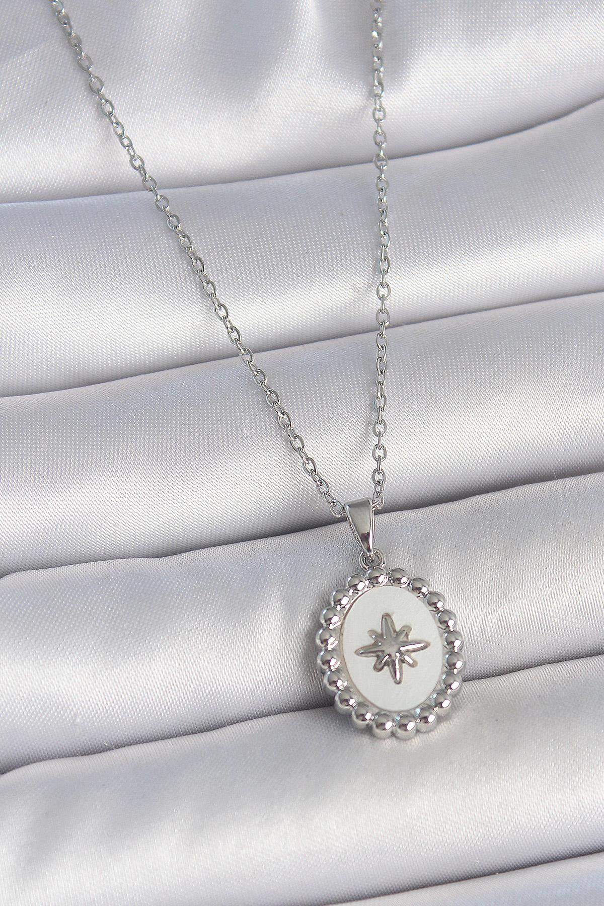 316L Çelik Gümüş Renk Zincir Beyaz Mineli Kutup Yıldız İşlemeli Madalyon Model Kadın Kolye