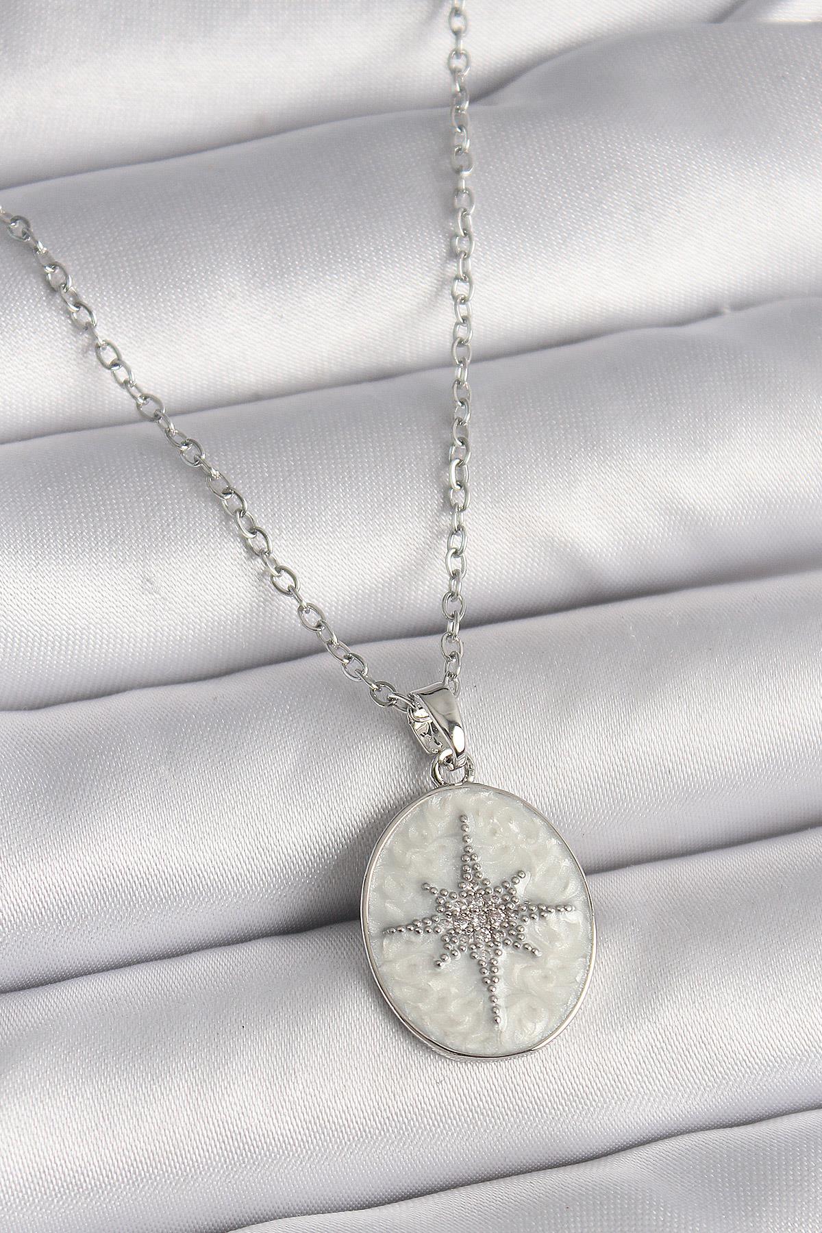 316L Çelik Gümüş Renk Zincir Beyaz Mineli Zirkon Taşlı Kutup Yıldız İşleme Kadın Kolye