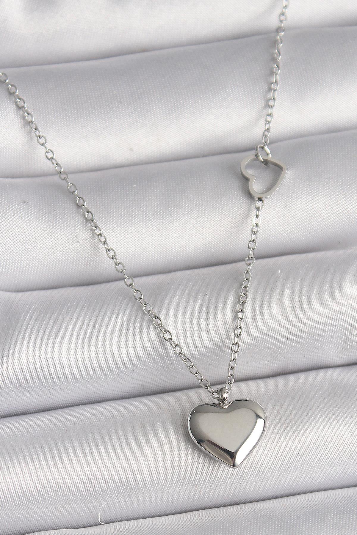 316L Çelik Gümüş Renk Zincir Kalp Detay Kalp Figür Kadın Kolye