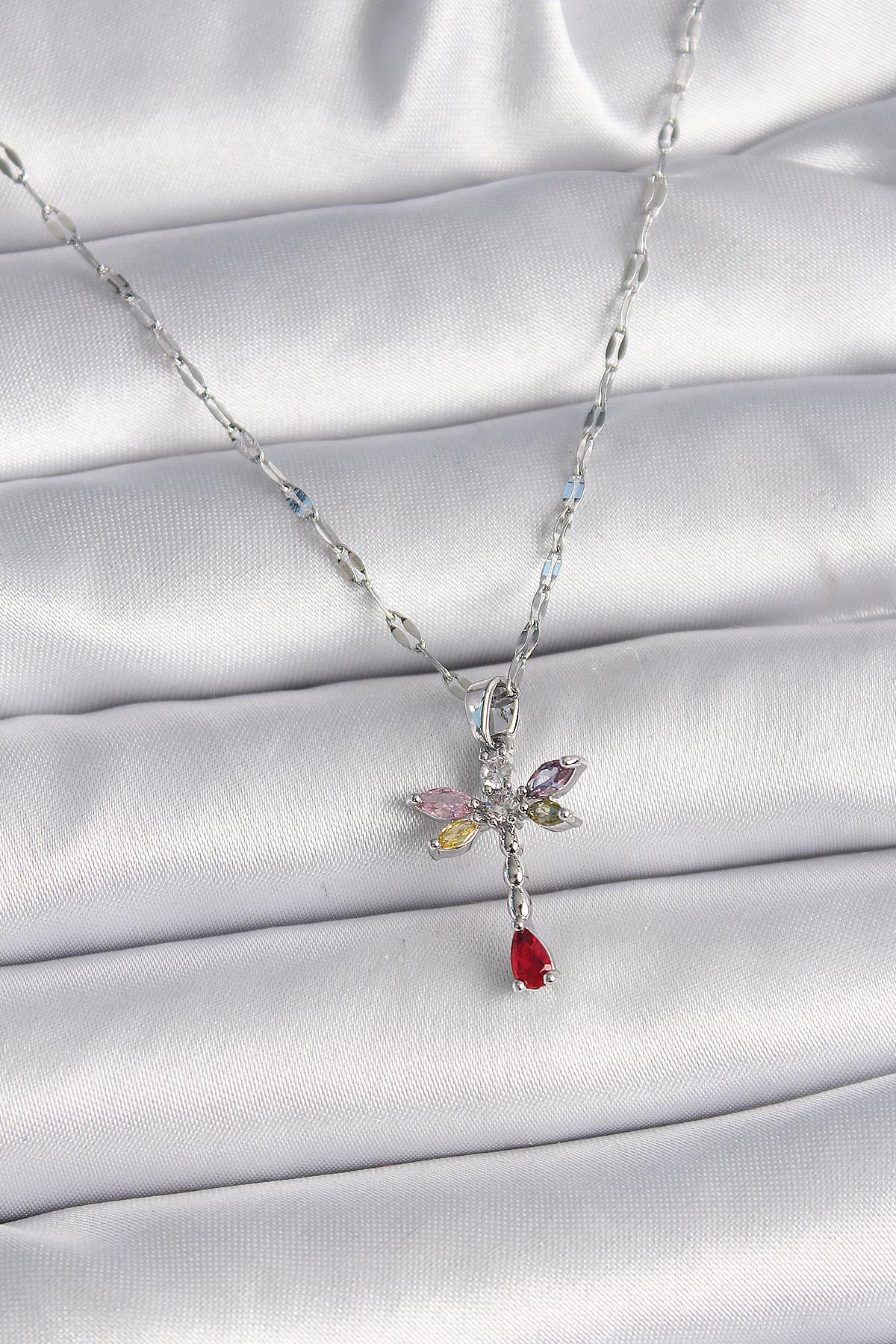 316L Çelik Gümüş Renk Zincir Renkli Zirkon Taşlı Yusufçuk Model Kadın Kolye