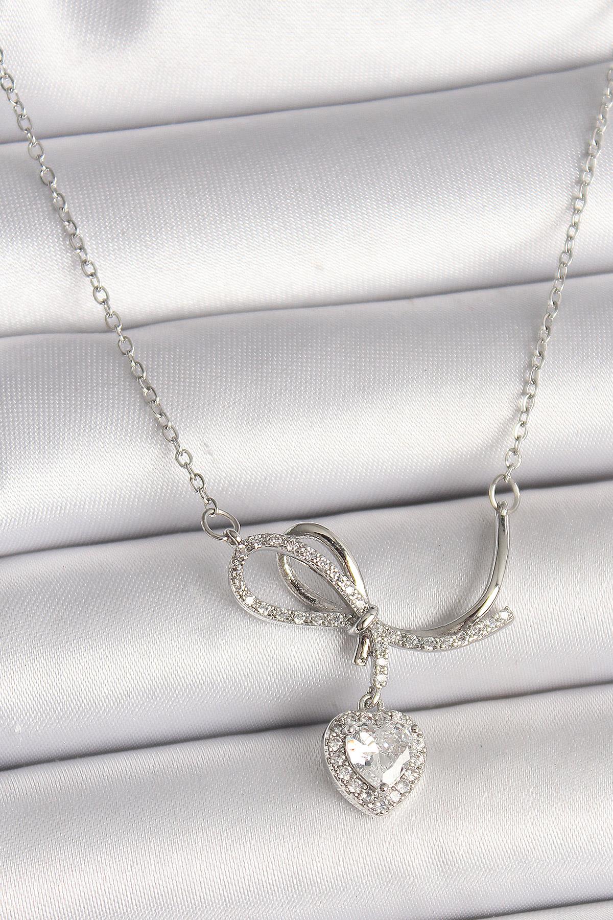 316L Çelik Gümüş Renk Zincir Zirkon Taşlı Düğüm Sallantı Kalp Figür Kadın Kolye