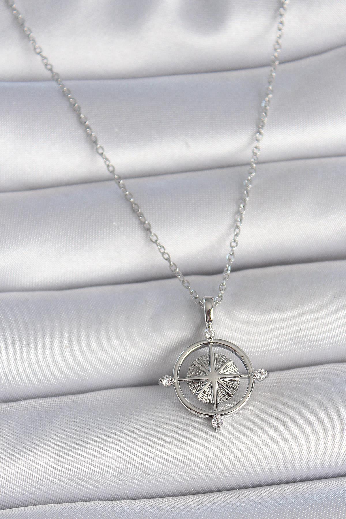 316L Çelik Gümüş Renk Zincir Zirkon Taşlı Pusula Model Kadın Kolye