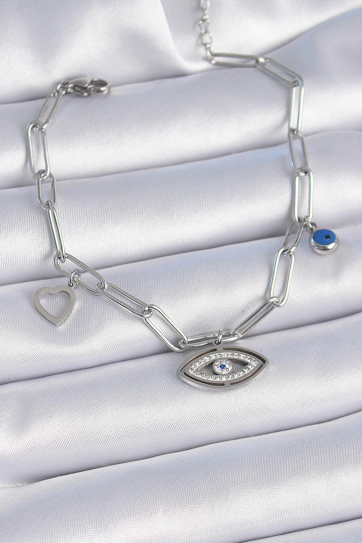 316L Çelik Gümüş Renk Zirkon Taşlı Göz Figür Kalp Detay Kadın Bileklik