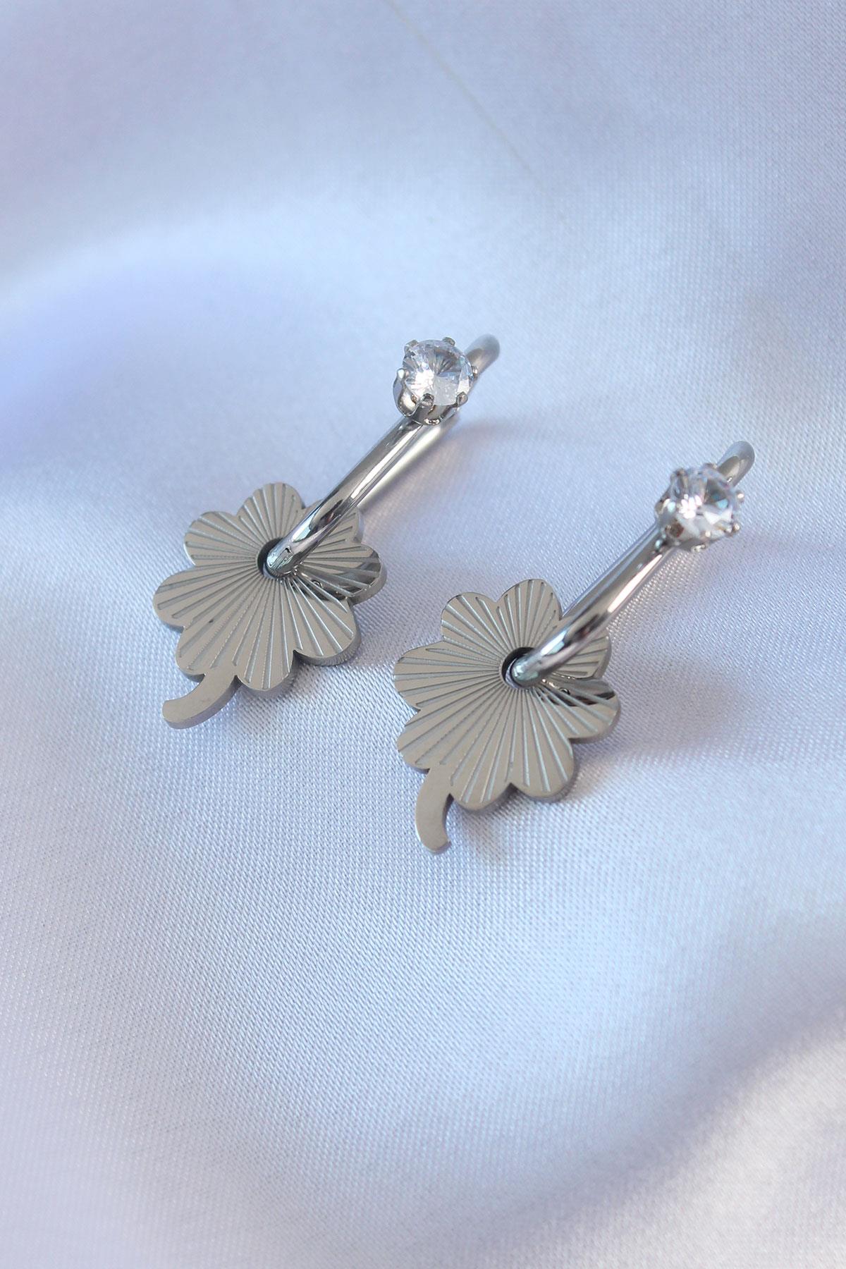 316L Çelik Gümüş Renk Zirkon Taşlı Kadın Göçmen Küpesi
