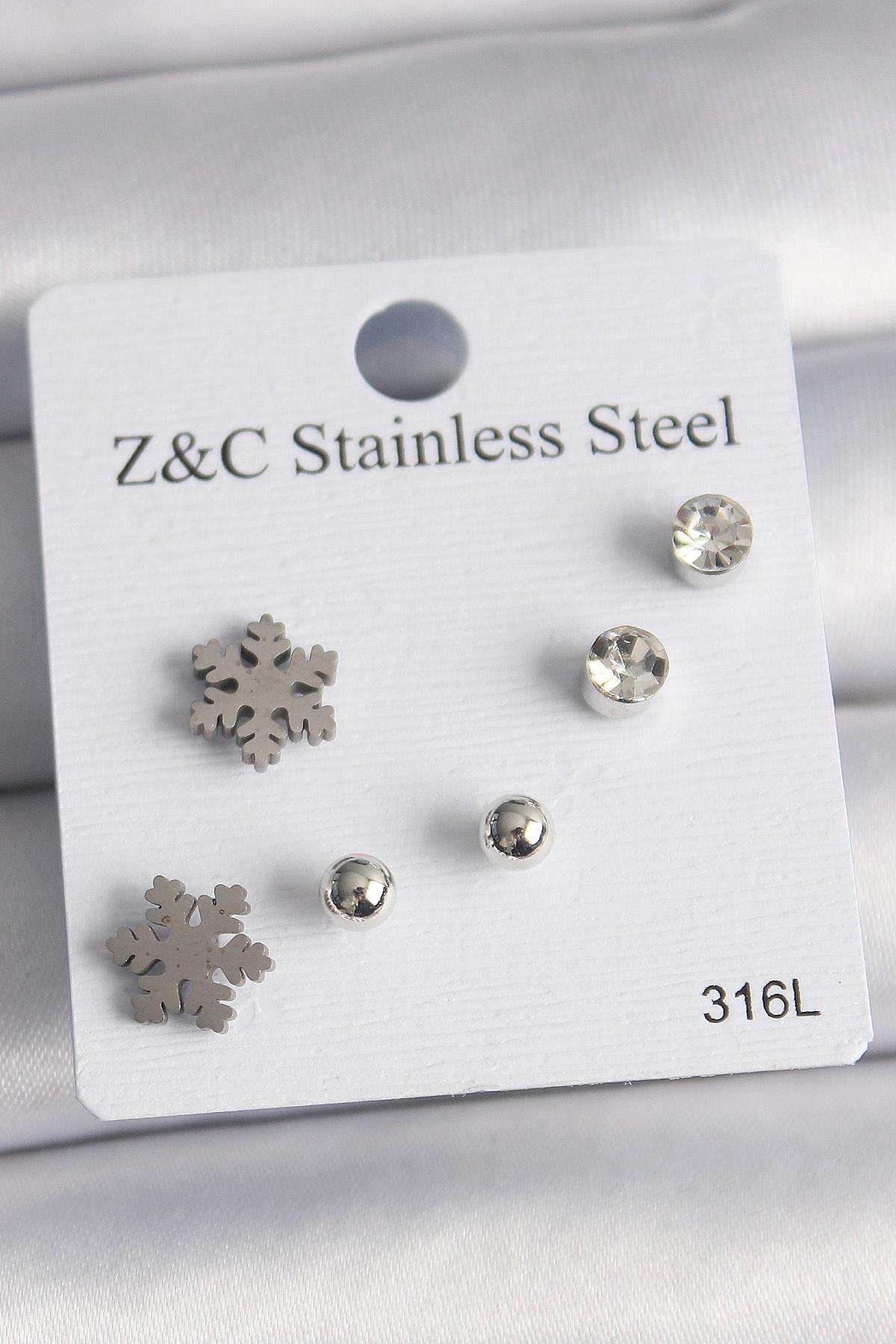 316L Çelik Gümüş Renk Zirkon Taşlı Kar Tanesi Model Kadın Küpe Seti