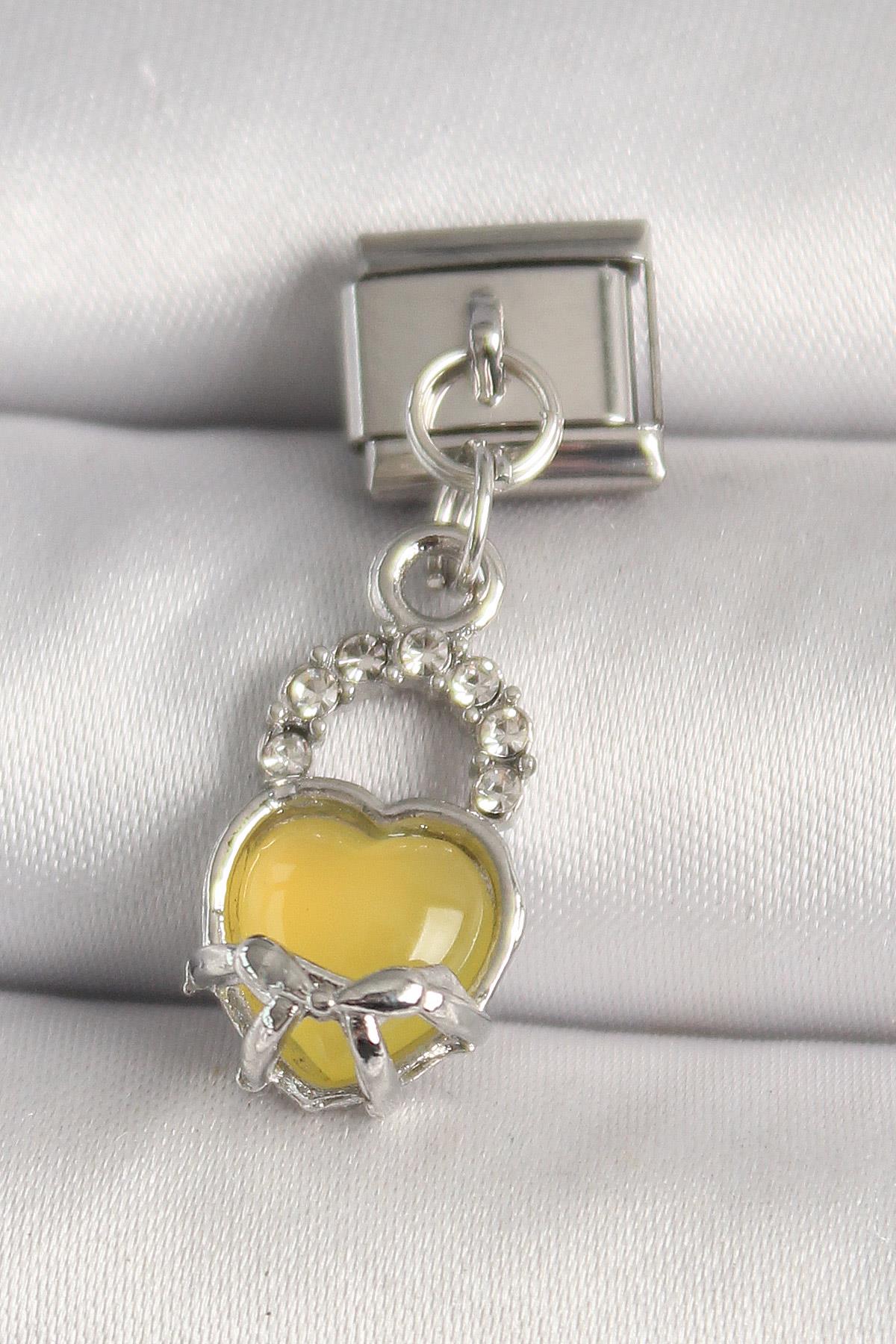 316L Çelik Gümüş Renk Zirkon Taşlı Sarı Kilit Kalp Model Nomination Charm