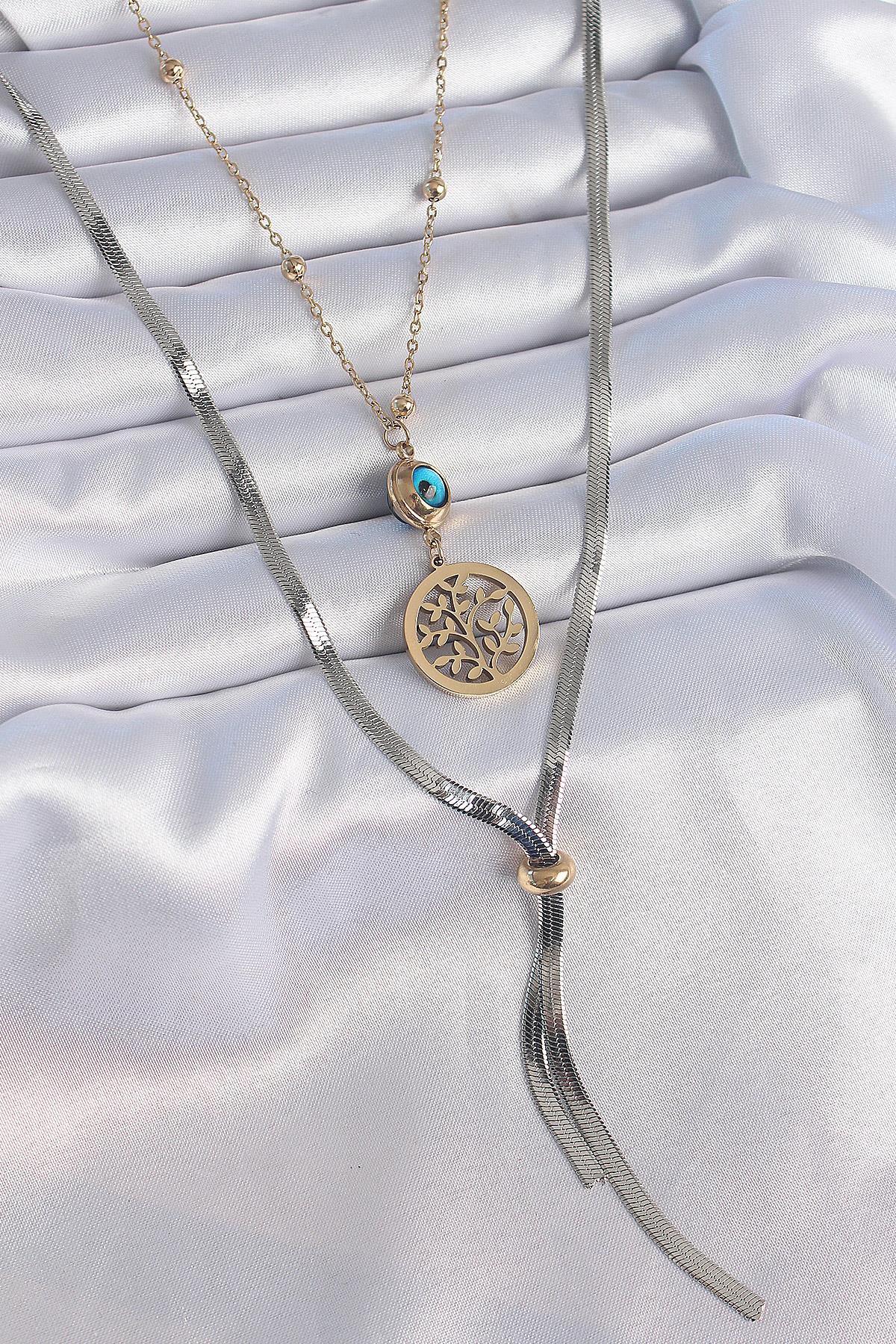 316L Çelik Mix Renk Filiz Figür Nazar Boncuk Detay Uzun Kadın Kolye
