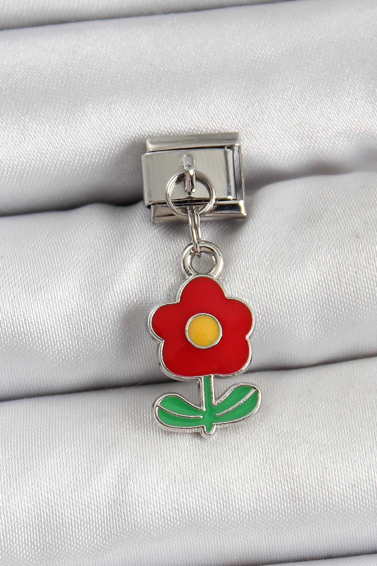316L Çelik Sallantılı Kırmızı Papatya Model Gümüş Renk Nomination Charm