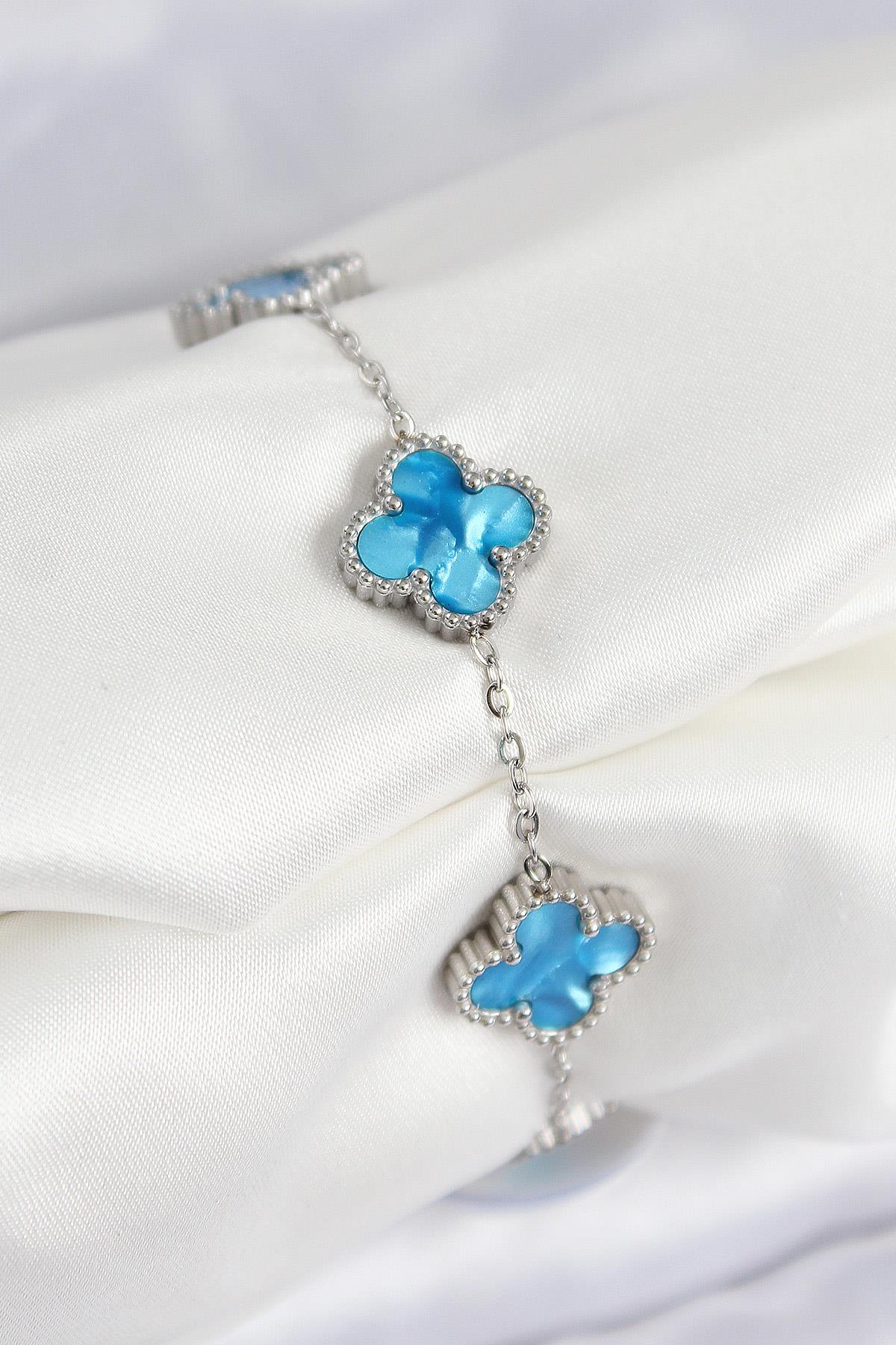 316L Çelik Sedefli Gökyüzü Mavisi Gümüş Renk Yonca Kadın Bileklik