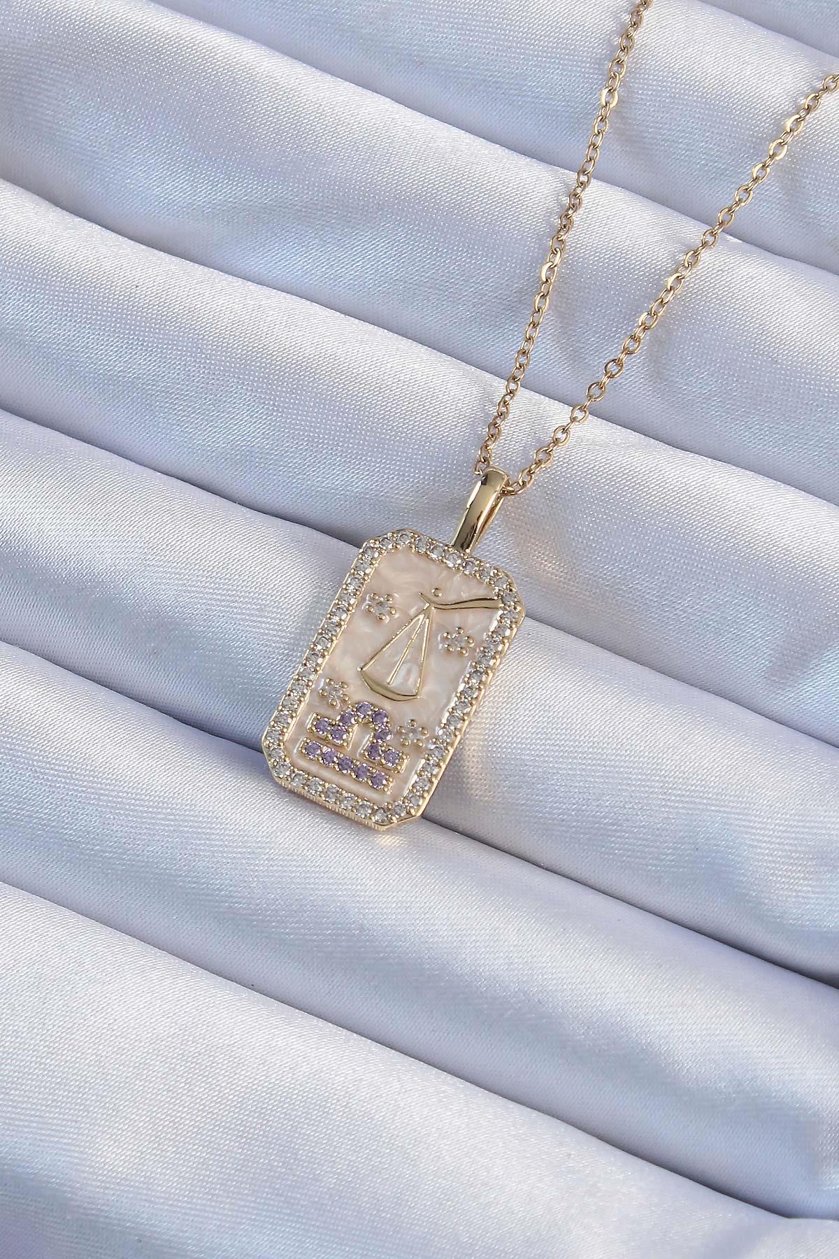 316L Çelik Zincir Altın Renk Lila Zirkon Taşlı Tarot Kolye