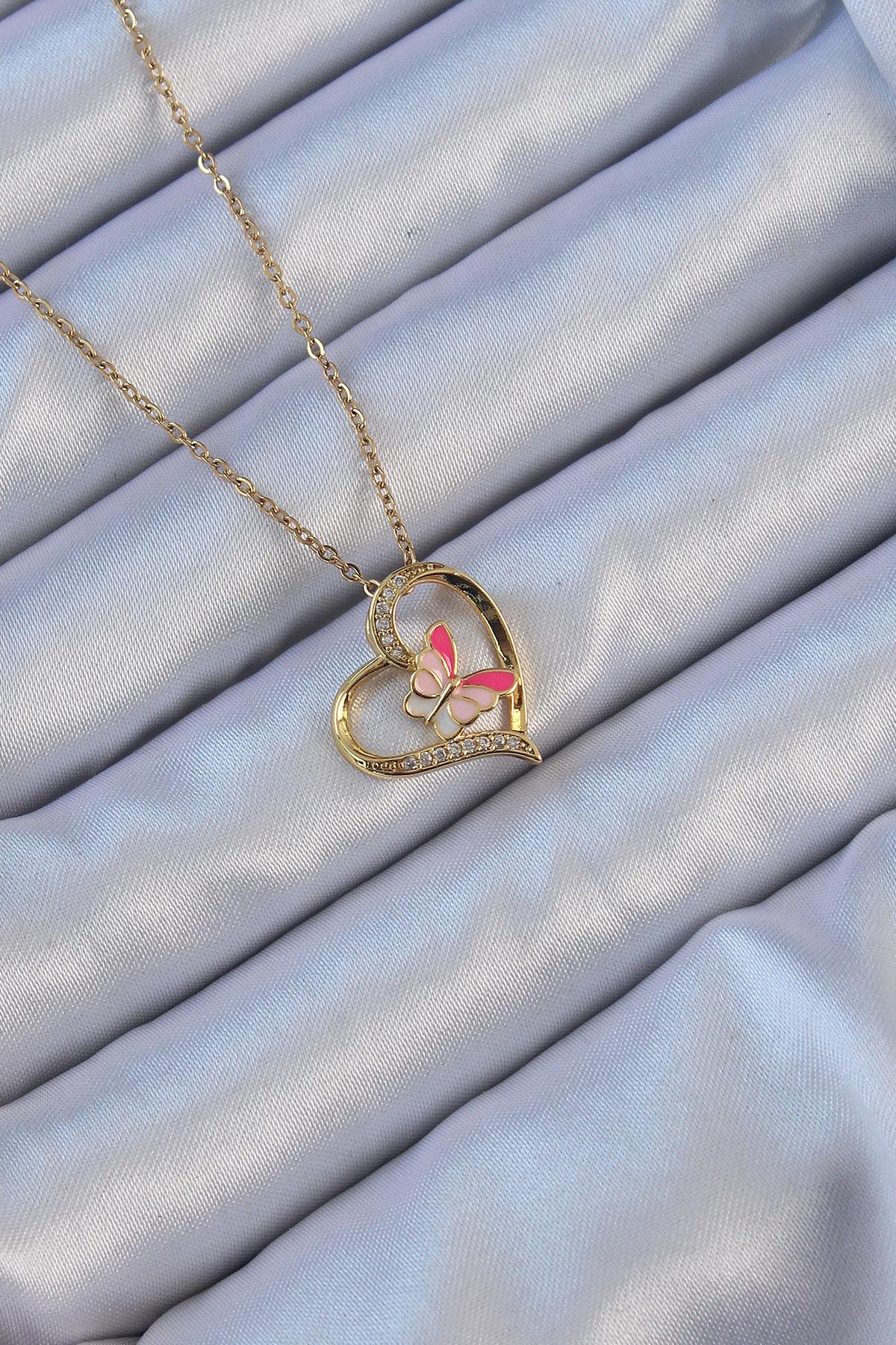 316L Çelik Zincir Altın Renk Mineli Kelebek Figür Zirkon Taşlı Kalp Kolye