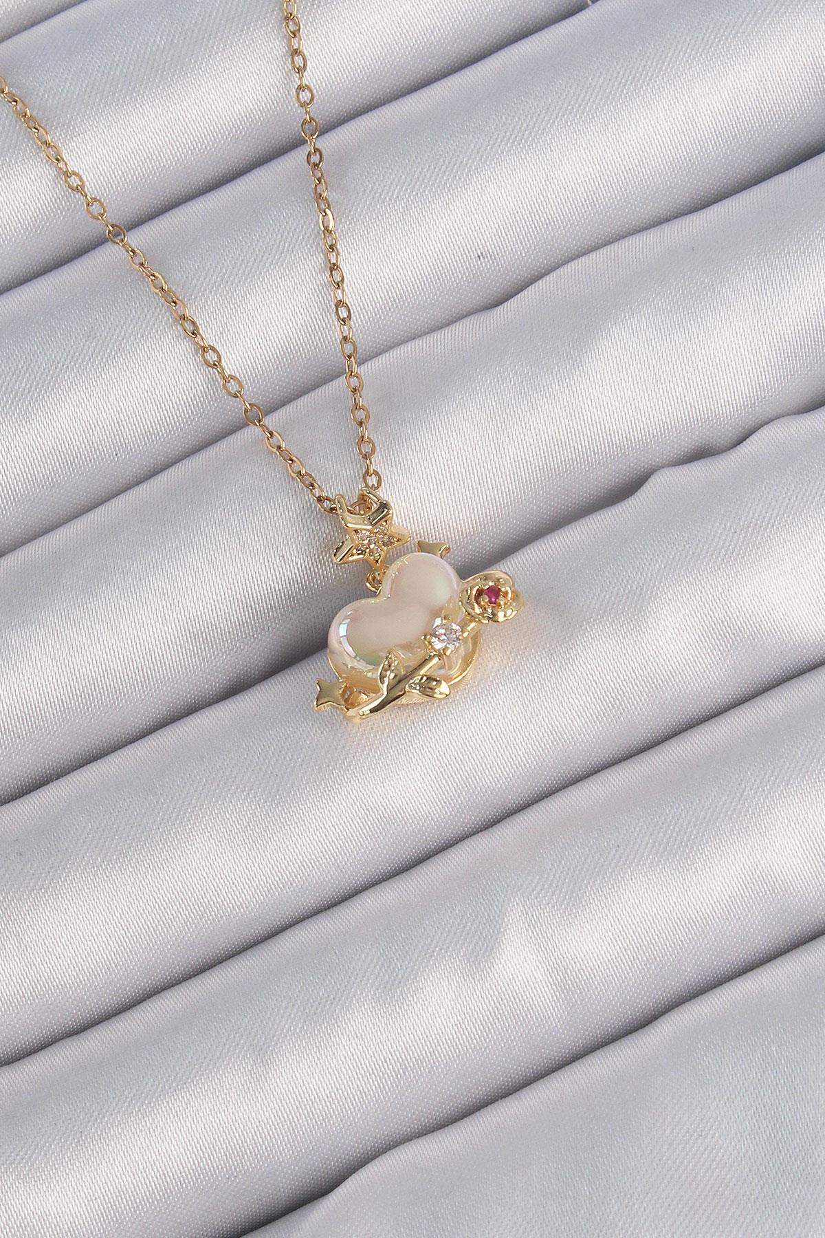 316L Çelik Zincir Altın Renk Sedefli Kalp Figür Zirkon Taşlı Gezegen Kolye