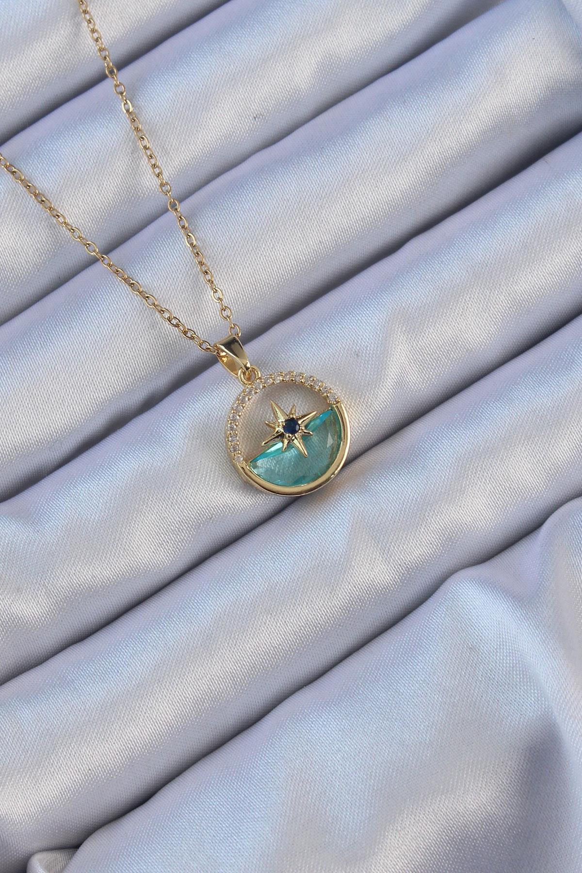 316L Çelik Zincir Altın Renk Zirkon Taşlı Deniz Görünüm Kutup Yıldızı Kolye