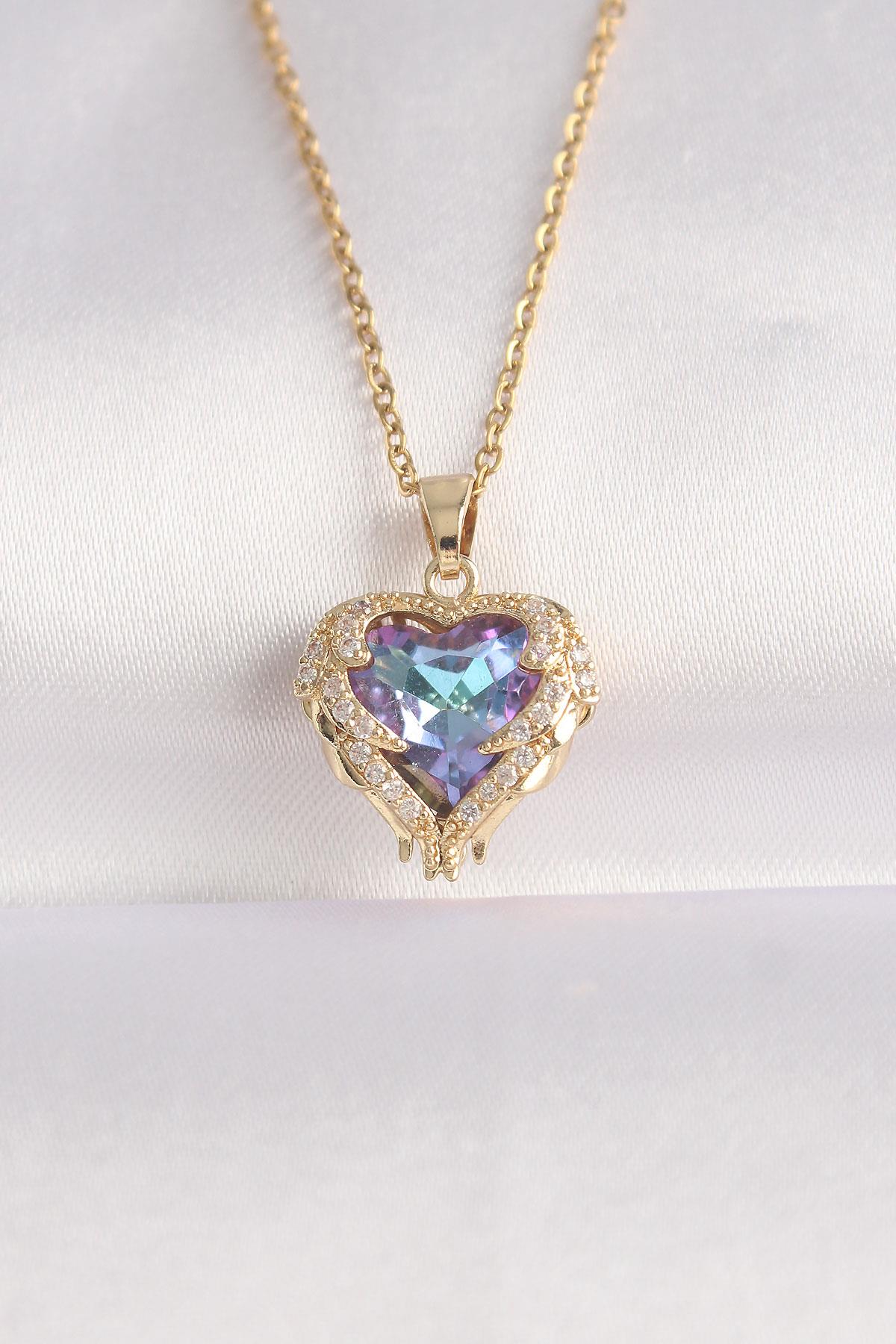 316L Çelik Zincir Altın Renk Zirkon Taşlı Mavi Mor Renkli Kalp Figür Kolye