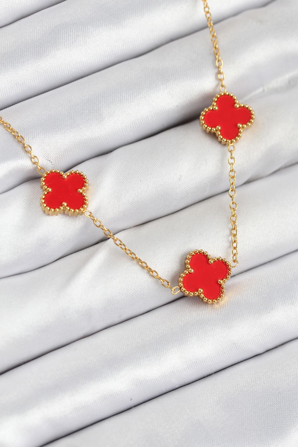 316L Çelik Zincir Gold Kırmızı Renk Yonca Kadın Kolye