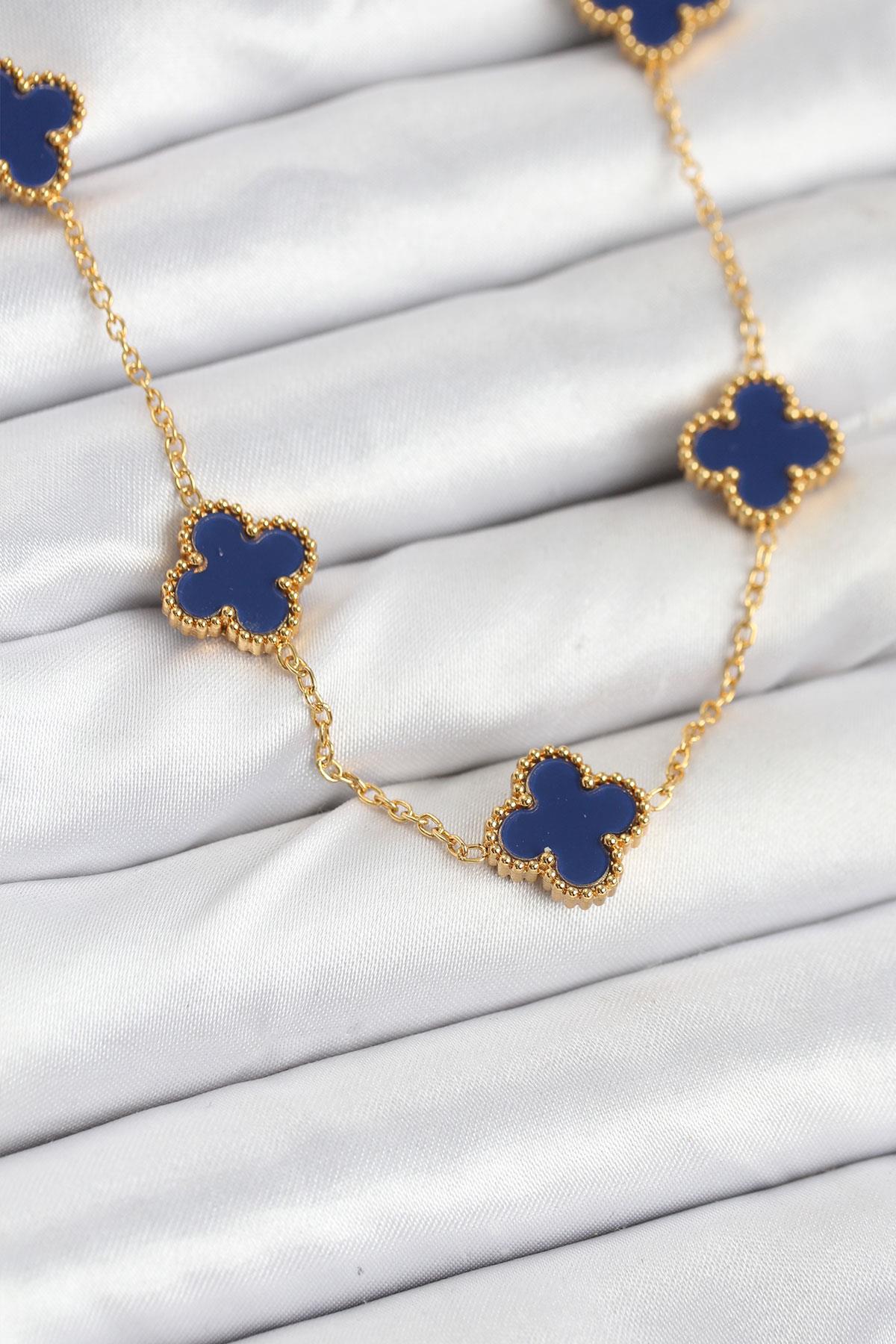 316L Çelik Zincir Gold Renk Lacivert Yonca Kadın Kolye