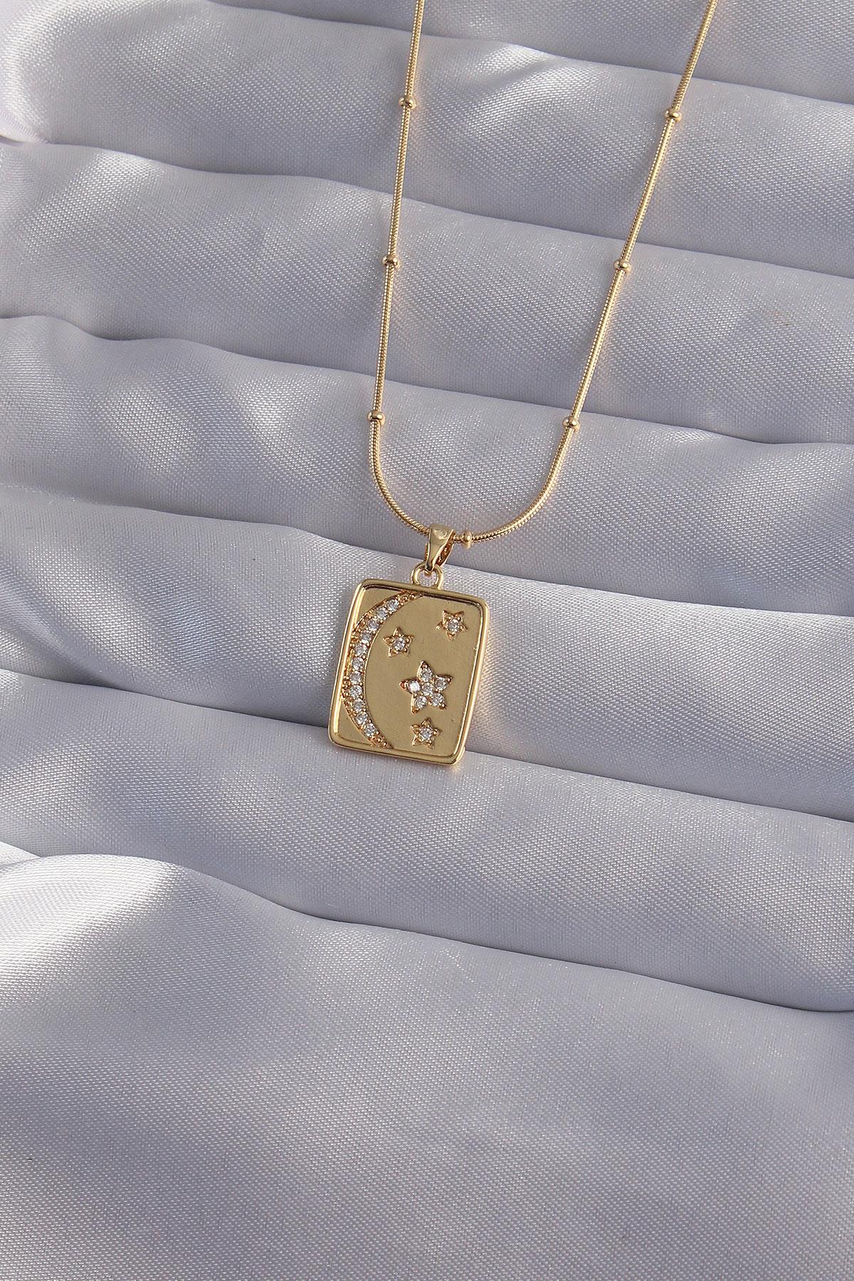 316L Çelik Zincir Gold Renk Zirkon Taşlı Ay Yıldız Figürlü Tarot Kolye