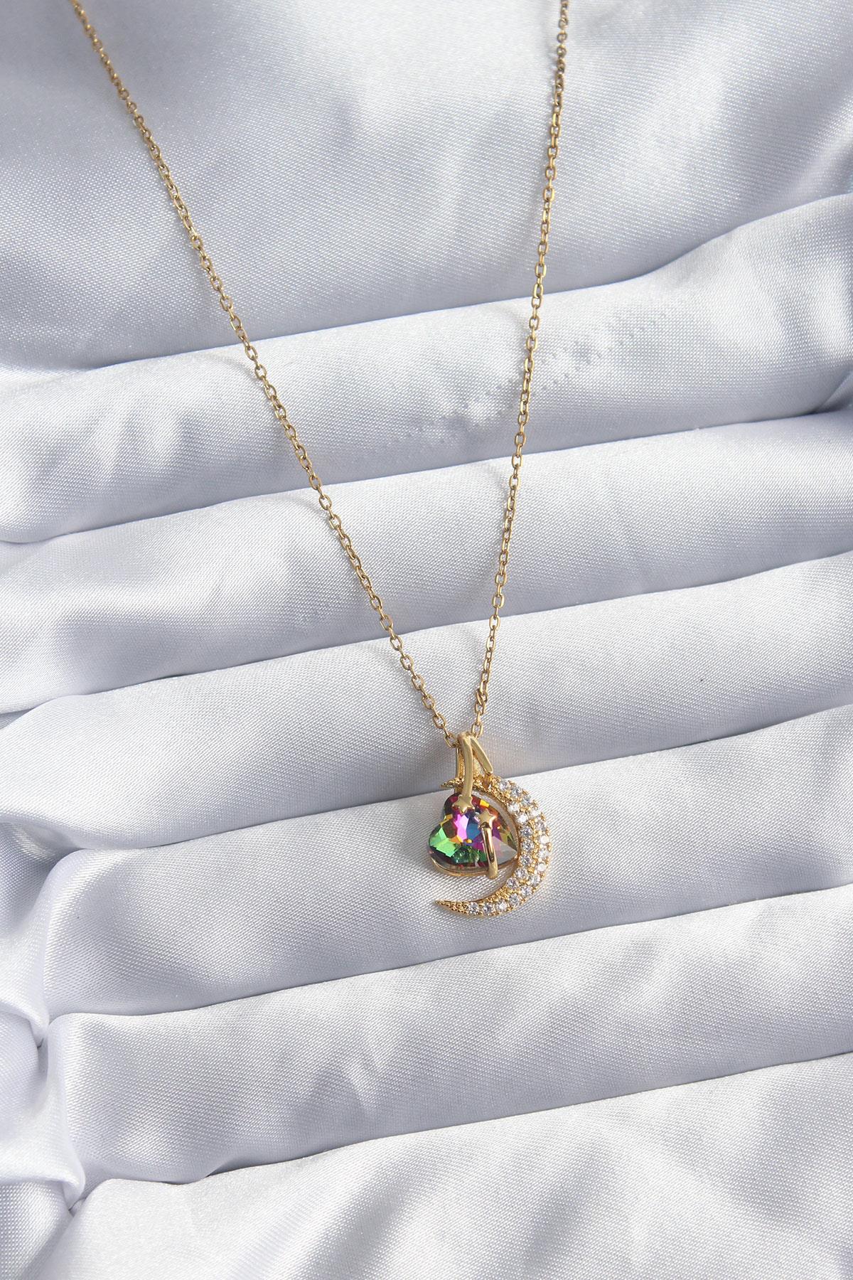 316L Çelik Zincir Gold Renk Zirkon Taşlı Hilal Kristal Kalp Model Kadın Kolye
