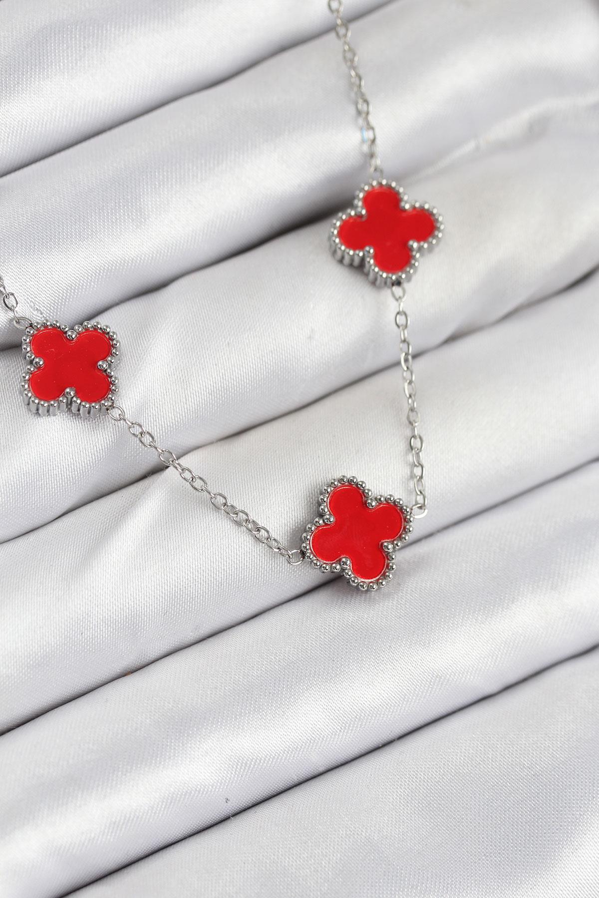 316L Çelik Zincir Gümüş Kırmızı Renk Yonca Kadın Kolye